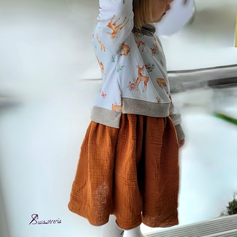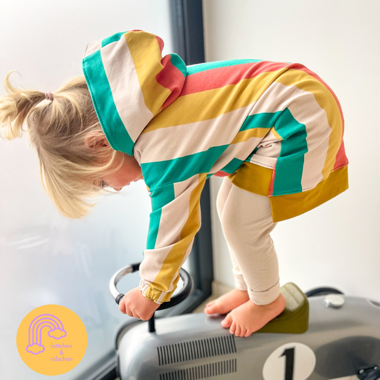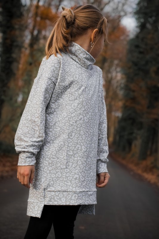 Es kann als Sweater, Hoodie oder mit Rollkragen genäht werden... für die Mädchen gibt es zusätzlich noch eine Tunika und Kleid Variante mit gerafftem Volant. Neben 4 verschiedenen Kapuzen Möglichkeiten bringt das Schnittmuster auch noch verschiedenen Ärmel Abschlüssen mit sich. Diese können mit einem ganz klassischen Bündchen Abschluss, mit einem Gummizugsaum oder ganz romantisch mit Paperbag Abschluss genäht werden.