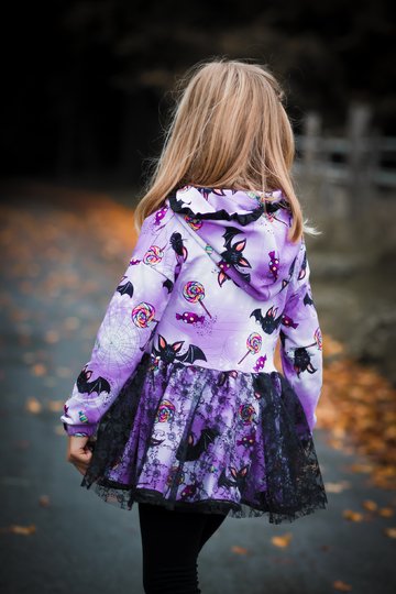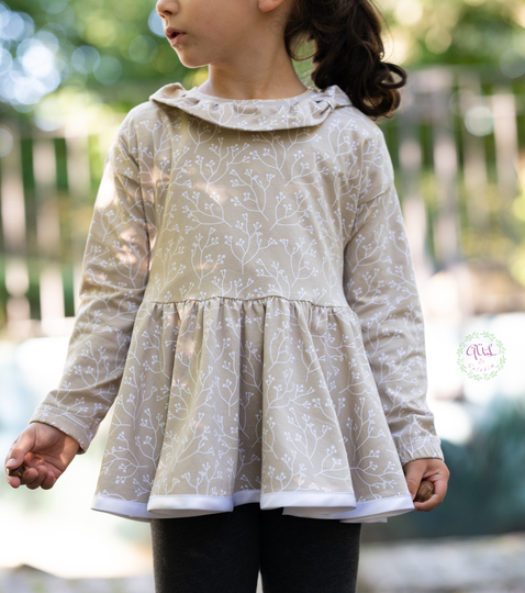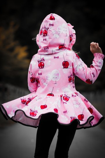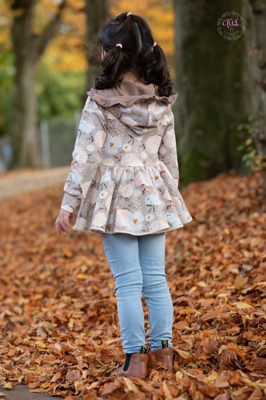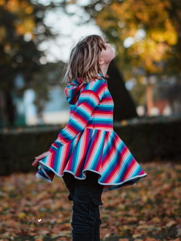 Die Tunika wird nicht normal gesäumt, sondern am Rock eingefasst, so fällt sie gleich noch schöner! Das Schnittmuster bringt viele tolle Möglichkeiten mit, so kann die Traumtänzerin mit einem süßen Rüschen-Kragen genäht werden oder auch ganz lässig und schick zugleich mit einer Rüschen-Kapuze.