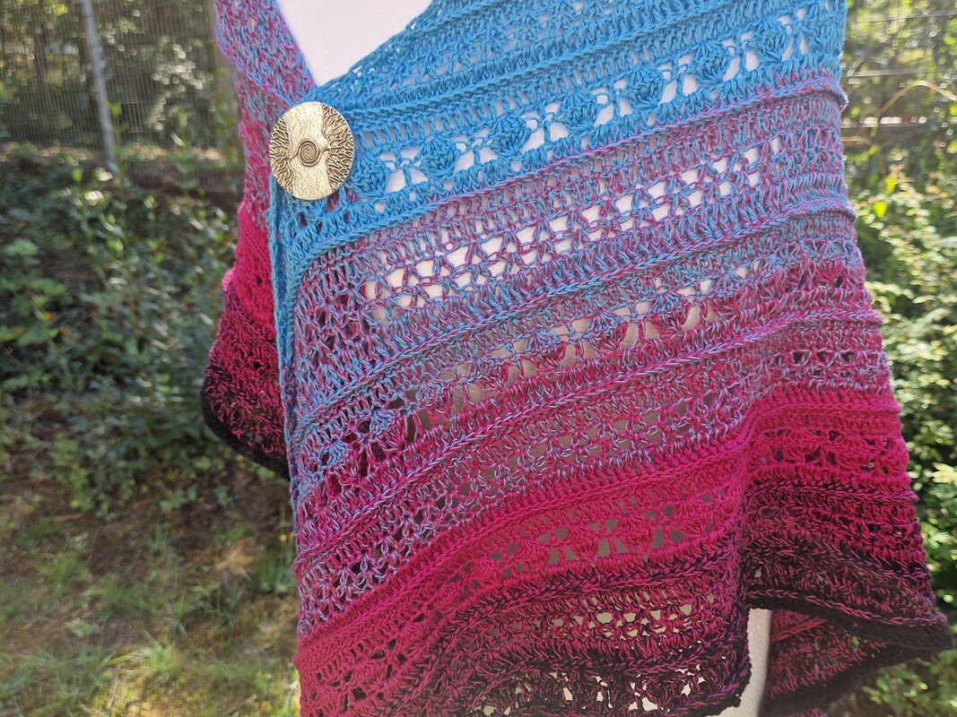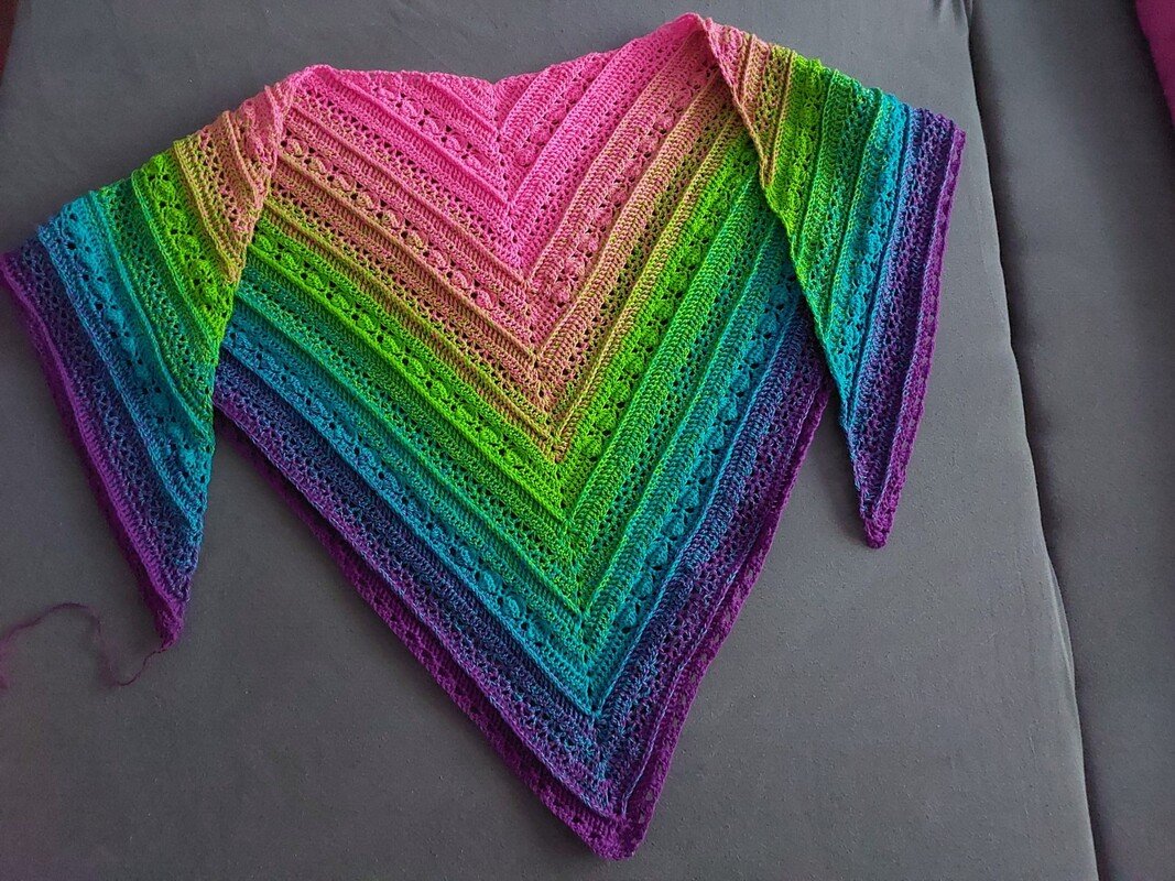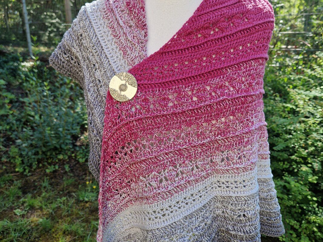 Die Größe des entstehenden Tuches ist abhängig von Deinem verwendeten Garn, der Größe der Häkelnadel und Deinem Stil zu Häkeln.