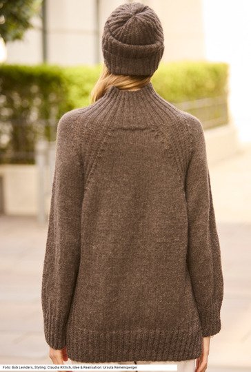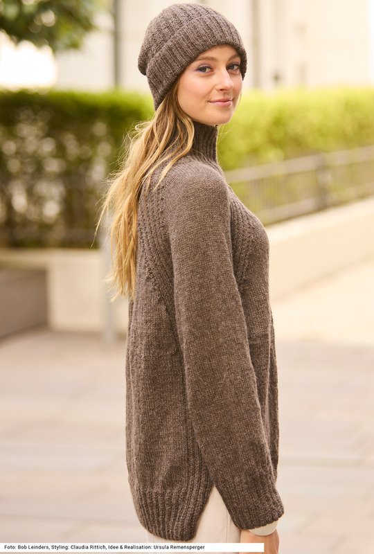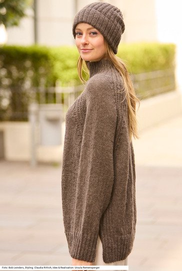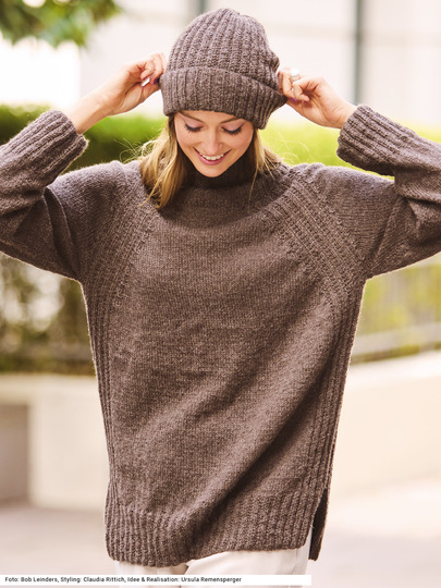 Dieses Set ist etwas für Fans von hochwertigen Garnen – die eingesetzte Qualität besteht zu 100 Prozent aus Lamawolle und ist daher entsprechend weich und kuschelig. Das breite Rippenmuster des Bunds läuft an den Seiten weiter und auch entlang der dadurch betonten Raglanschrägungen. Das gleiche Muster hat auch die Mütze mit breiter Krempe. Die Teile werden bis zu den Armausschnitten getrennt gestrickt, dann folgt die Passe rundum. Somit entsteht ein oversized geschnittenes Modell, mit Seitenschlitzen und Turtleneck-Kragen. Die Anleitung dafür gibt es in den Größen 38/40, 42/44 und 46/48.