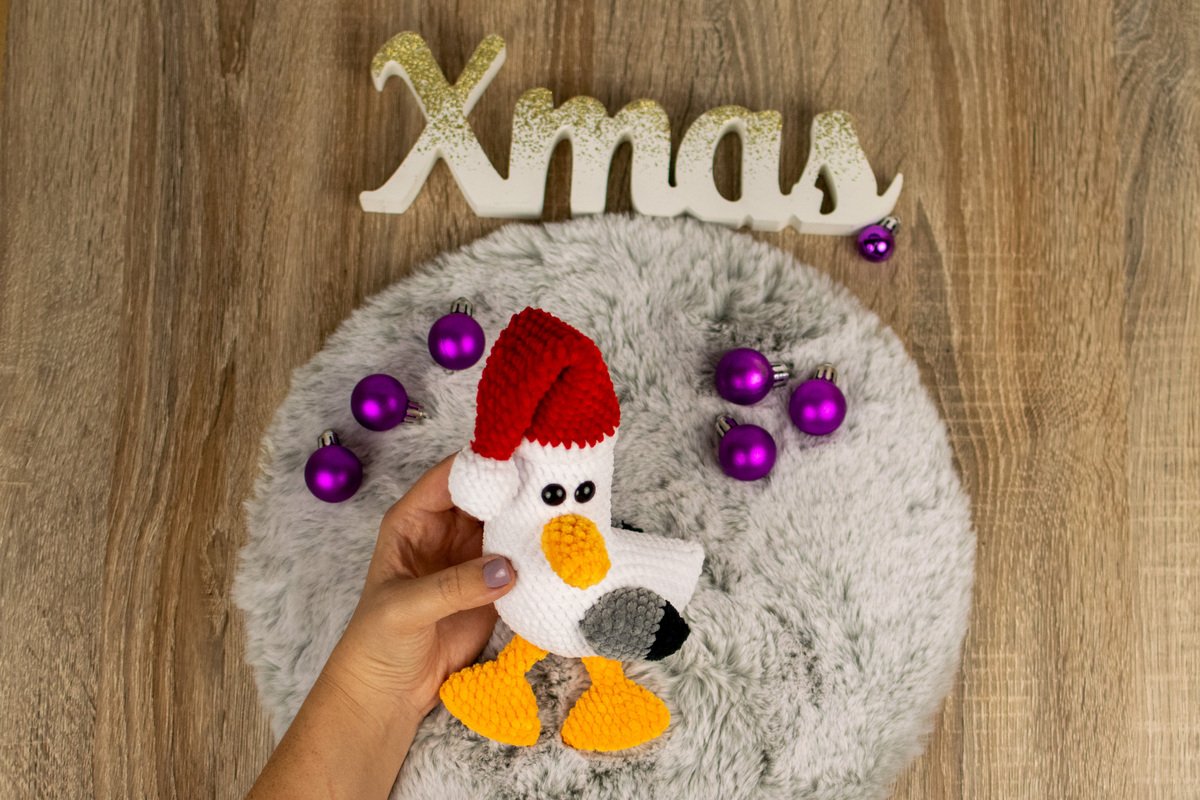 Mit dieser Häkelanleitung kannst du eine süße Möwe mit Weihnachtsmütze selber häkeln. Schritt für Schritt erkläre ich dir, wie der kleine Vogel entsteht – von Kopf und Körper bis zu den Flügeln und der festlichen Mütze. Am Ende hältst du eine ca. 20 cm große Amigurumi-Möwe in den Händen – perfekt als Geschenk oder als weihnachtliche Dekoration.