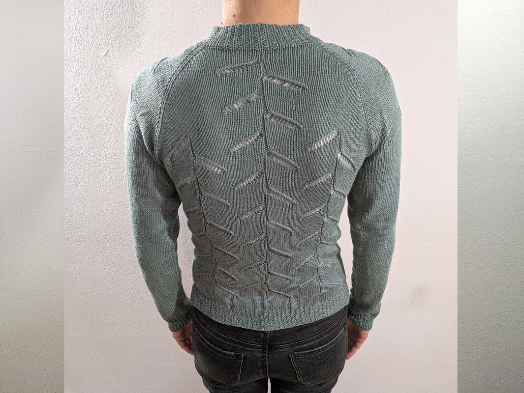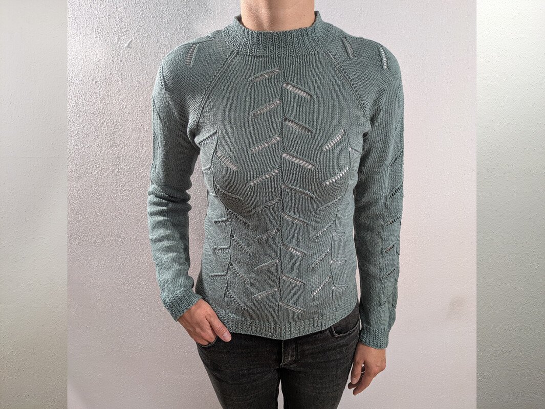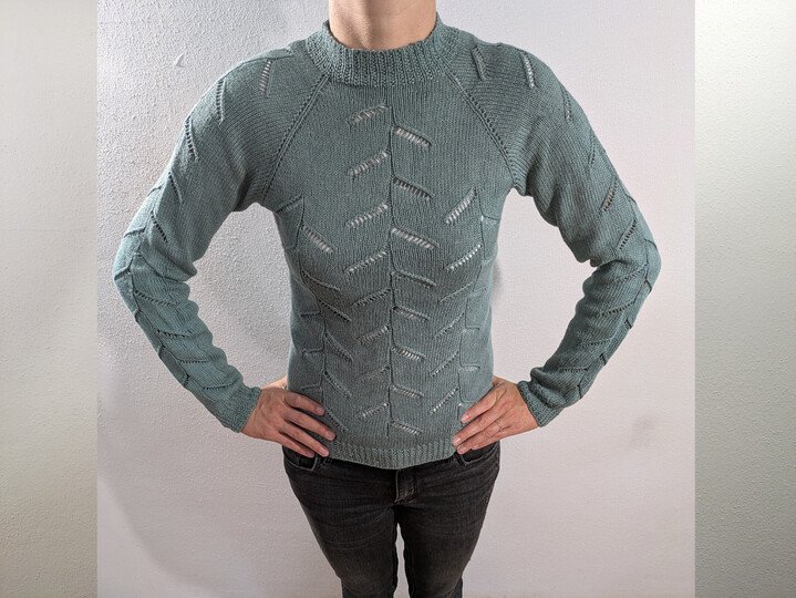 Dieser stylische Pulli mit Turtleneck-Kragen wird in einem Stück von oben nach unten ohne Zusammennähen gestrickt. Das Naturgarn aus Baumwolle/Viskose/Leinen ist angenehm weich und schimmert mit leichtem Glanz in einem aufregenden Türkis-Grün, passend zum Blattmuster auf Vorder-, Rückseite und Ärmeln.