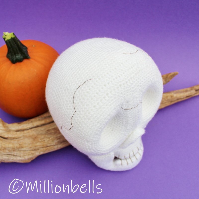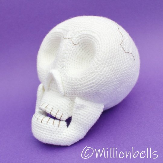 Die tiefen Augenhöhlen und der Oberkiefer werden beim Häkeln mit dem Totenkopf verbunden. Im Inneren des Unterkiefers befindet sich Chenilledraht, der ihm Form und Stabilität verleiht. Alle Teile in dieser Anleitung werden in Spiralrunden gearbeitet.