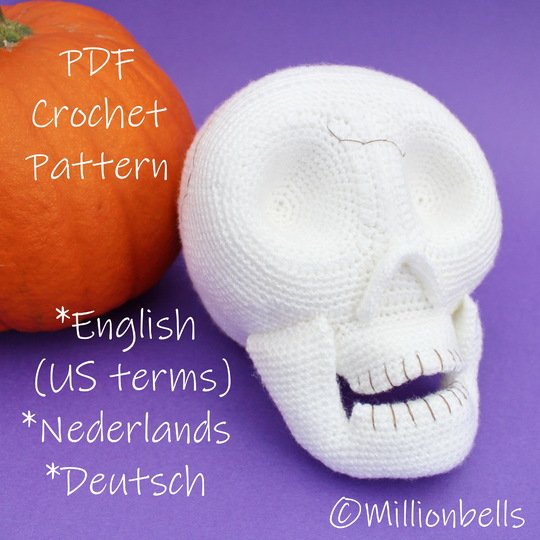 Diese Anleitung beschreibt wie man einen gruseligen, aber wunderschönen Amigurumi-Totenkopf häkelt, wie auf den Bildern gezeigt - perfekt für Ihre Halloween-Dekoration! Hergestellt aus weichem 8-fädiges Acrylgarn (DK) und Häkelnadelgröße 3 mm, beträgt die fertige Größe ca. 18 x 14 x 14 cm (H x B x T).