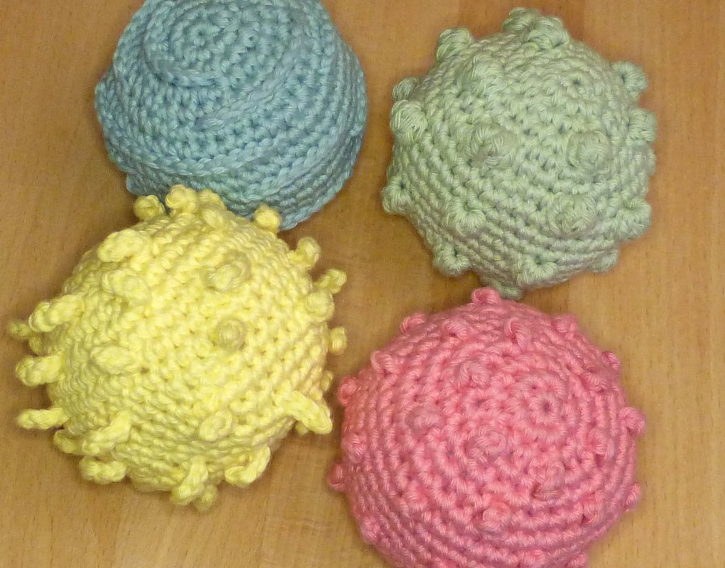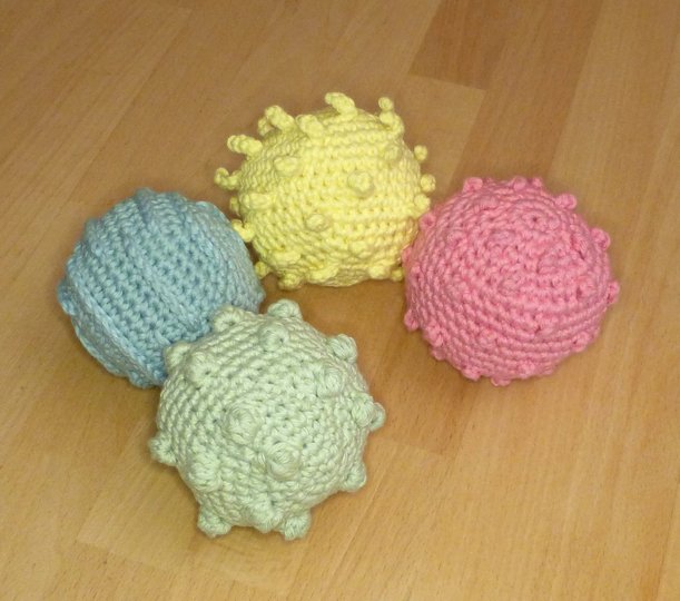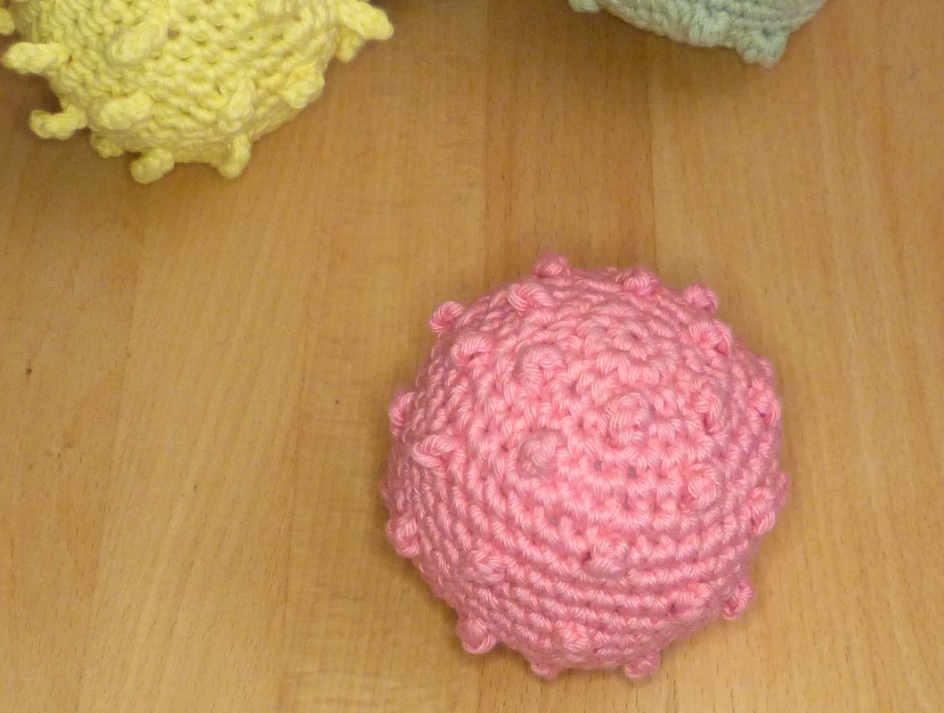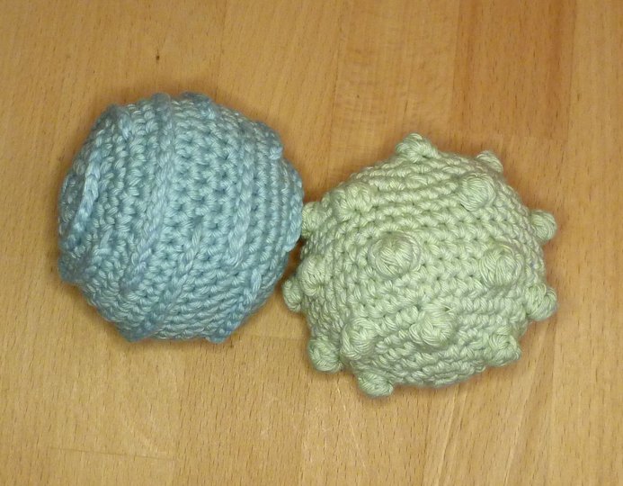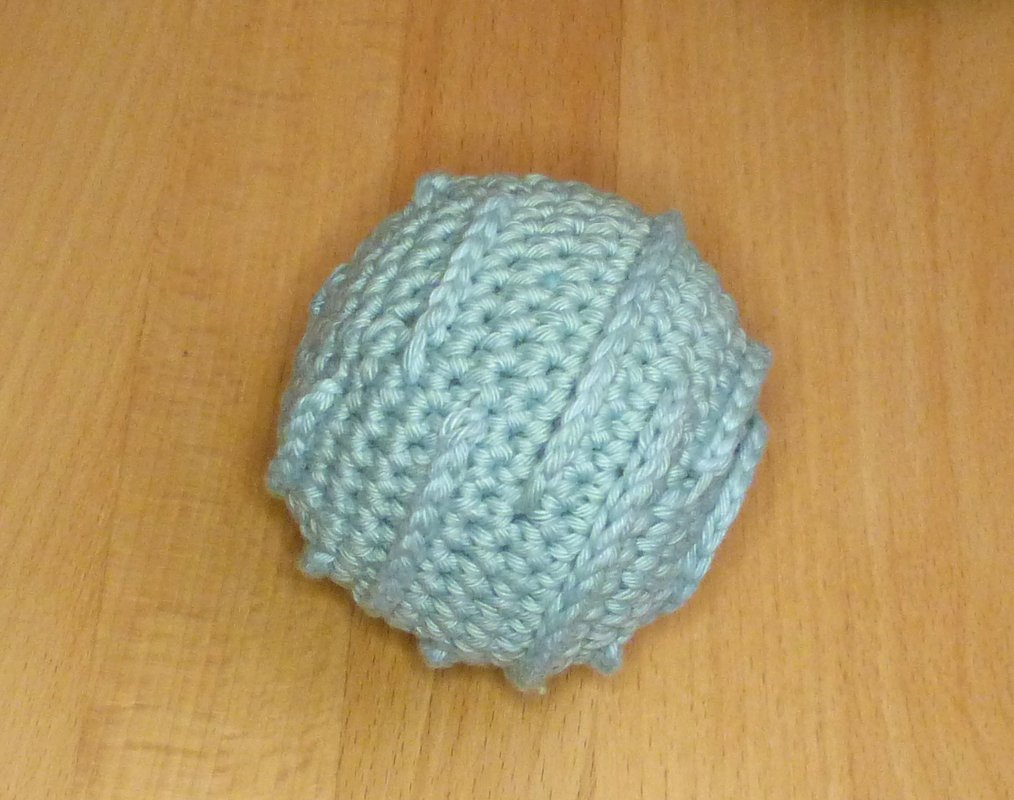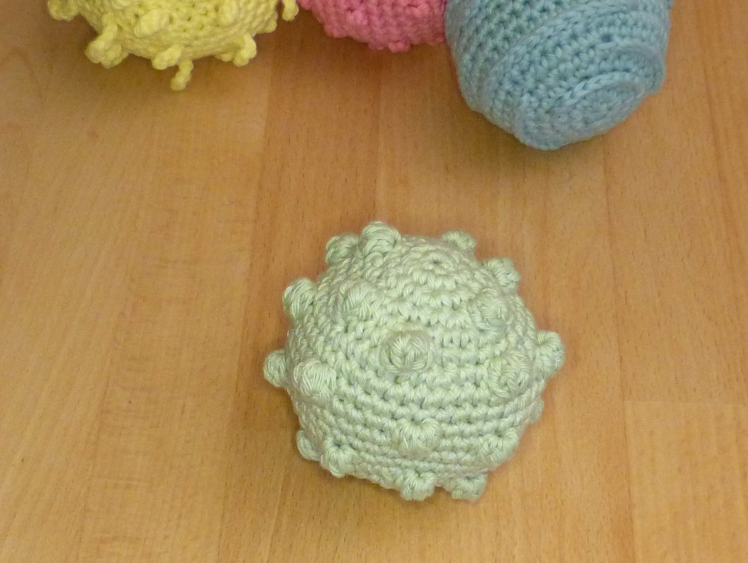 Ein Ball ist ein tolles Spielzeug für bewegungsfreudige Babys ab ca. 6 Monaten und bietet viele Möglichkeiten, motorische und sensorische Fähigkeiten zu trainieren: Man kann ihn fühlen, greifen, sehen, werfen, rollen und hinterher krabbeln. Die verschiedenen Oberflächen Noppen, Rippen und Fransen können mit den Fingern entdeckt werden, eine Rassel oder ein Glöckchen bietet zusätzlich akustische Reize. Das gehäkelte Spielzeug ist leicht und es geht nicht kaputt, wenn es mal runterfällt!