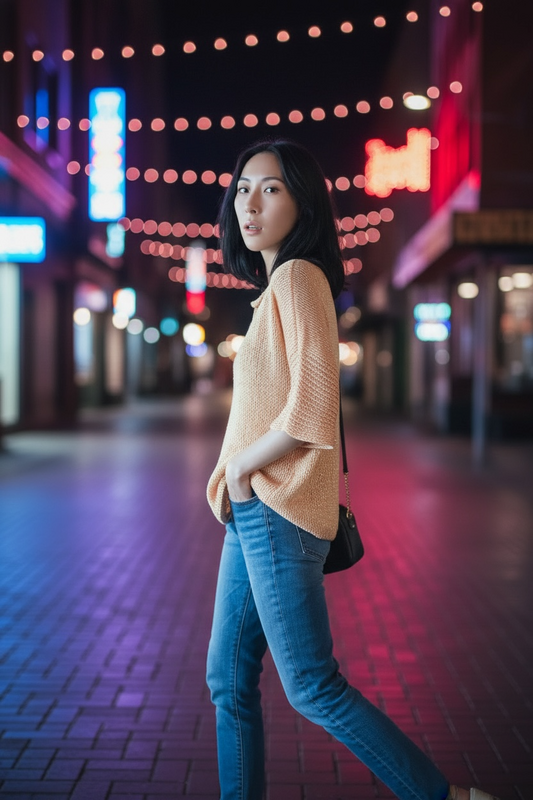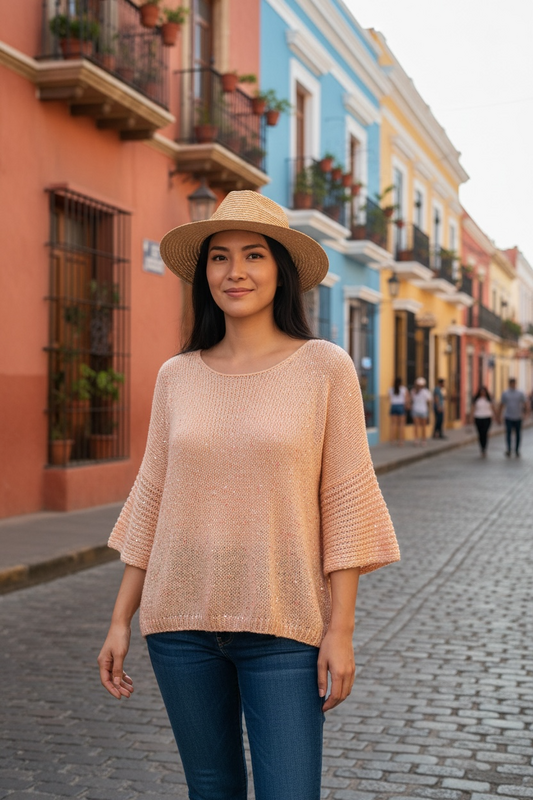 Shirt Bambola ist ein einfach gestricktes Shirt aus Pailettengarn mit direkt angestrickten Ärmeln, die individuell in der gewünschten Länge angepaßt werden können.