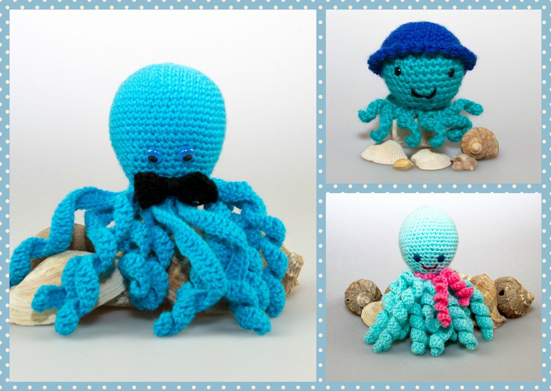 Gehäkelt werden: Kind-Octopus (Körper, Fangarame, Sommerhütchen), Mama-Octopus (Körper, Fangarame, Schal), Papa-Octopus (Körper, Fangarame, Fliege)