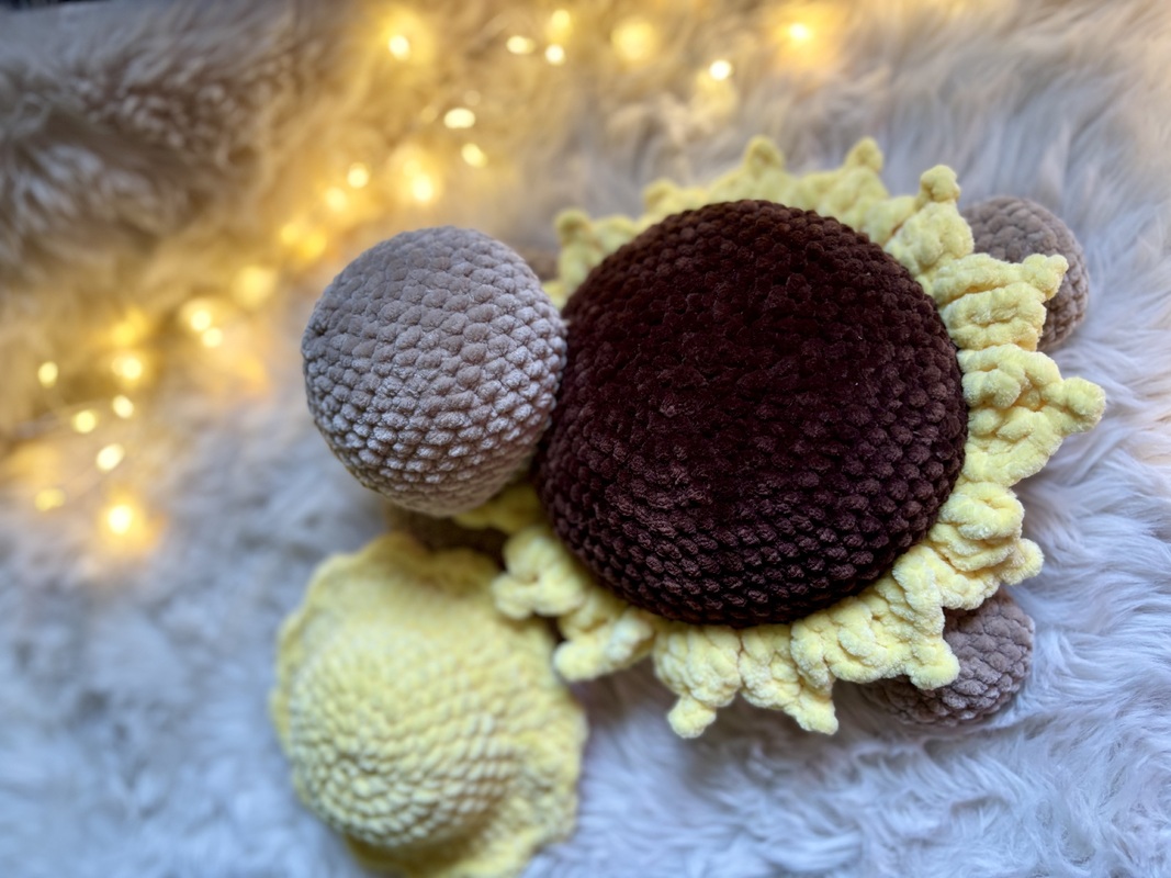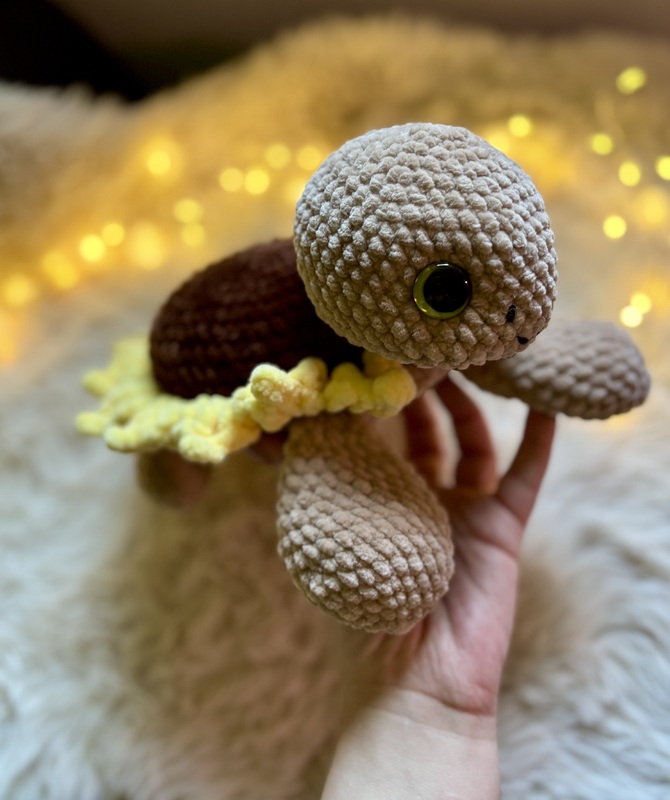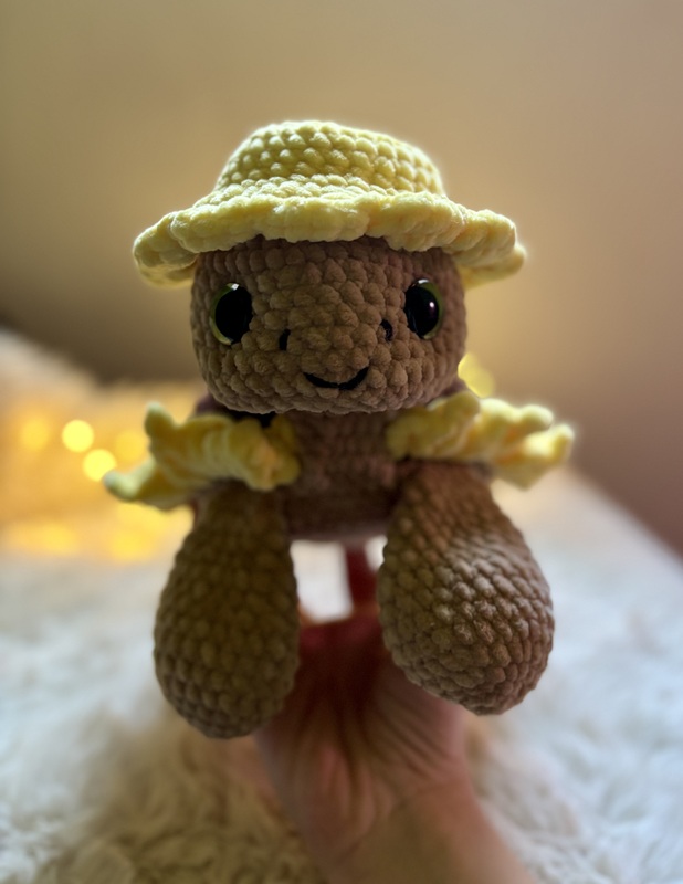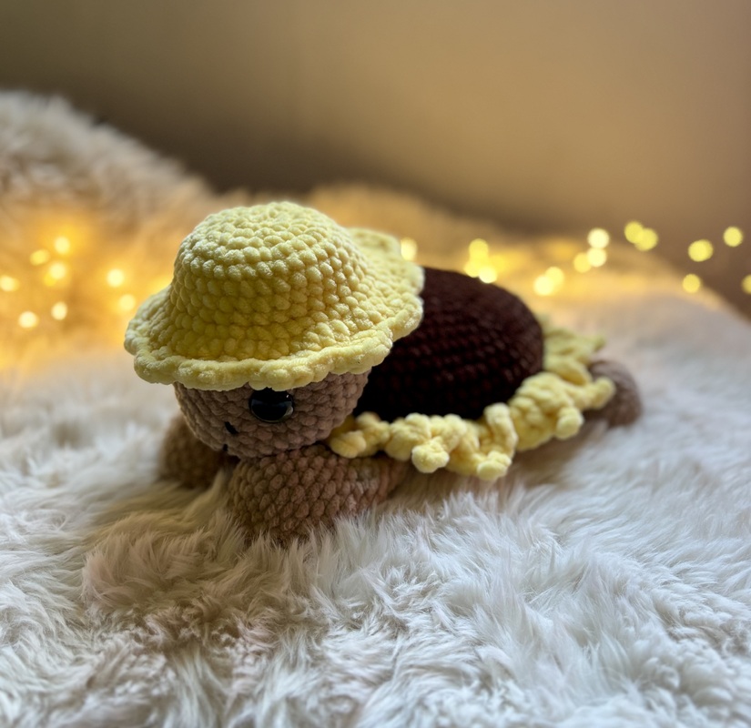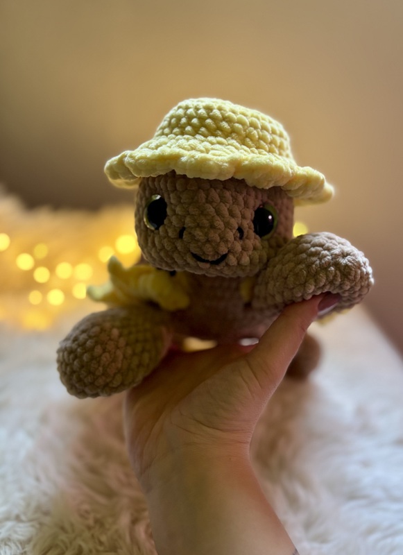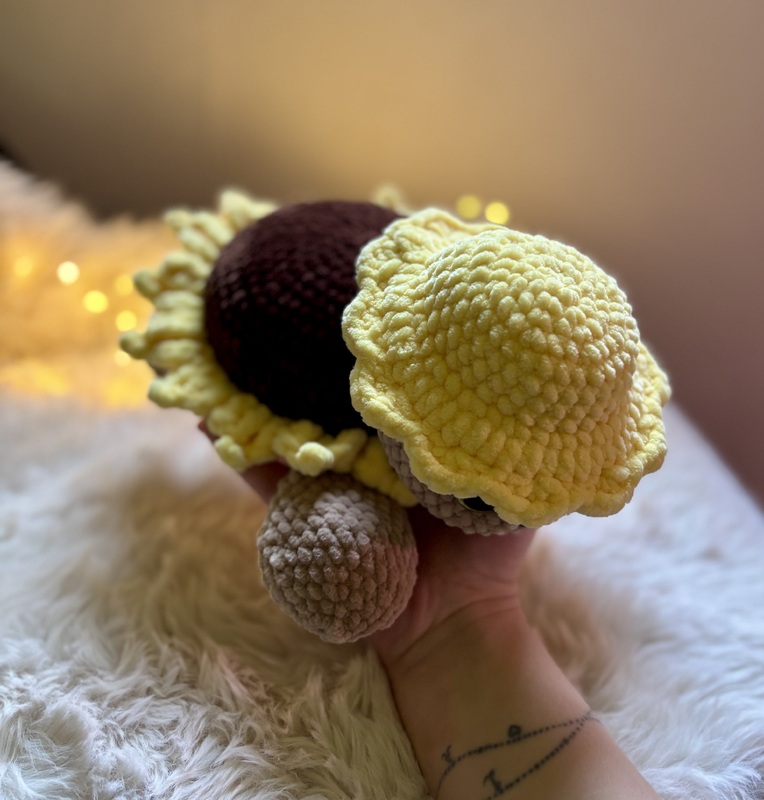 Mit ihrem weichen Chenillegarn, dem sonnigen Blütenhut und den strahlenden Blütenblättern bringt Sonnely gute Laune in jedes Zuhause. Ob als Deko für den herbstlichen Tisch, als Geschenk für Sonnenblumen-Fans oder als fröhlicher Begleiter auf dem Sofa – diese Amigurumi-Schildkröte sorgt garantiert für ein Lächeln.