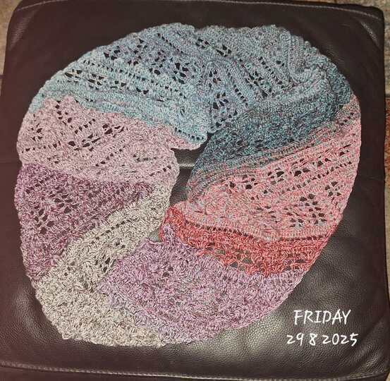 und mit ca 700m 3-fädigem Garn und Nadelstärke 2 wurde sind es 166x25cm geworden.