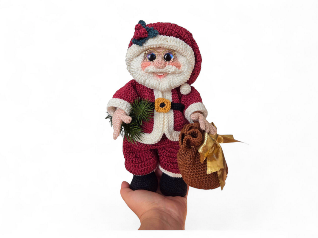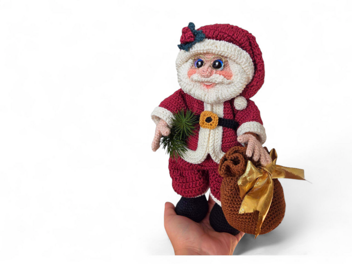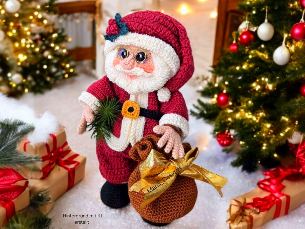 Mit Hilfe dieser Schritt-für-Schritt-Anleitung kannst du einen traditionellen Weihnachtsmann häkeln. Die Anleitung enthält viele Bilder und detaillierte Anweisungen, damit du sie gut nacharbeiten kannst. Nickie ist in Chenille beeindruckende 60 cm groß und sieht vor dem Weihnachtsbaum oder in einer schön dekorierten Ecke großartig aus. Der Weihnachtsmann aus Baumwolle ist hingegen kleiner und somit ein tolles Geschenk. Der Jutesack bietet außerdem viel Platz für allerlei Überraschungen.