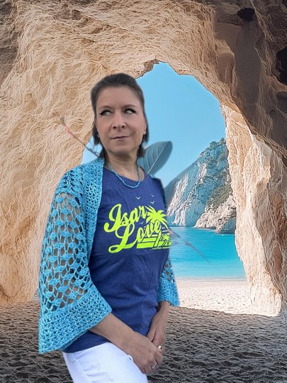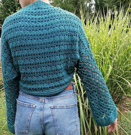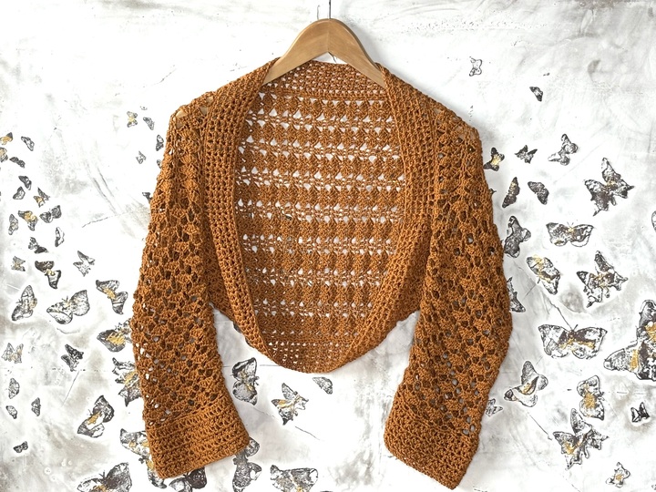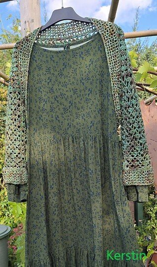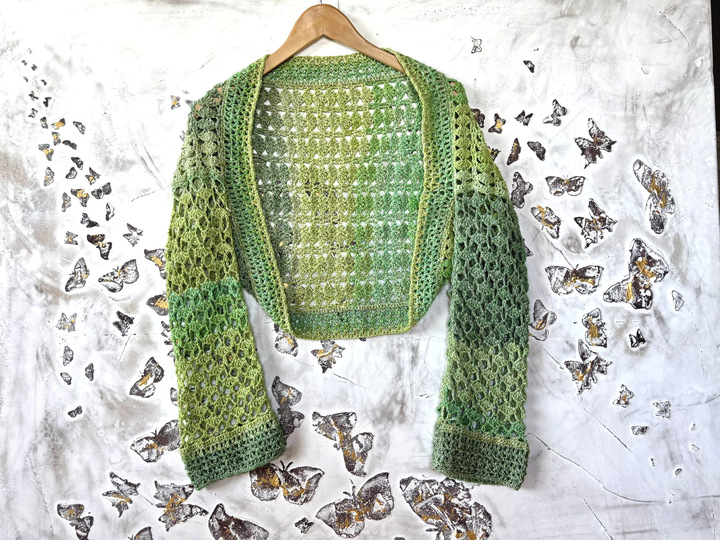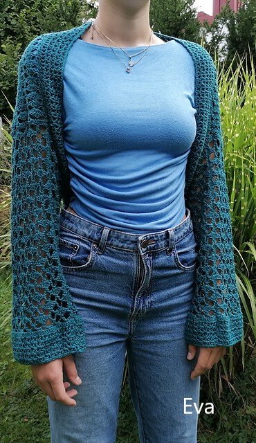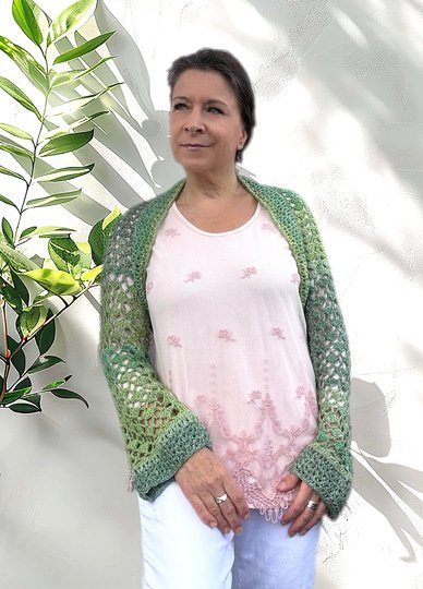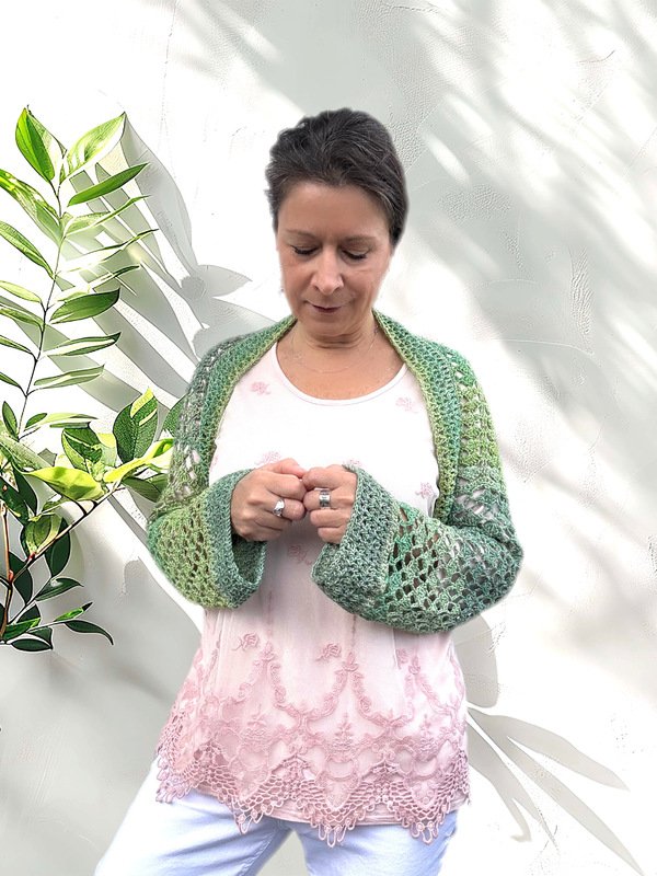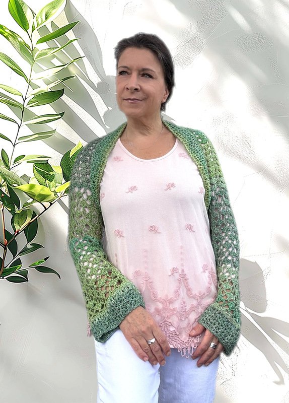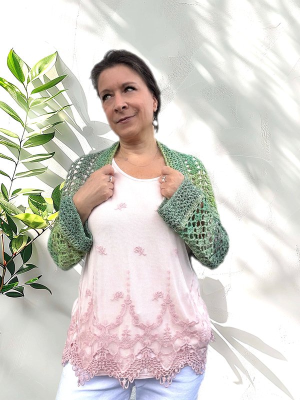 Die Ärmellänge kannst du frei wählen. Der Schnitt ist so angelegt, dass du bequem hineinschlüpfen kannst – die Brust bleibt dabei unbedeckt. Gehäkelt wird seitwärts in zwei Richtungen, ganz ohne störende Mittelnaht am Rücken.