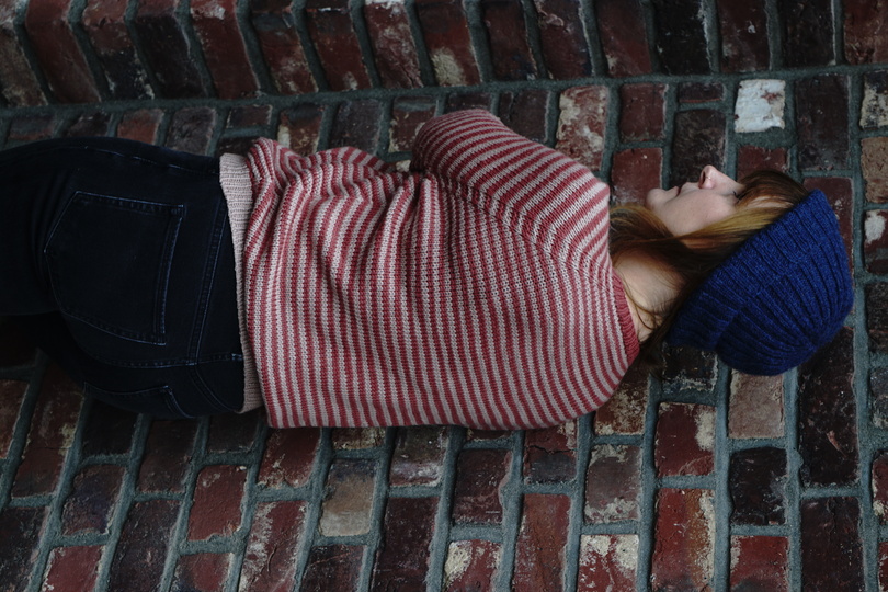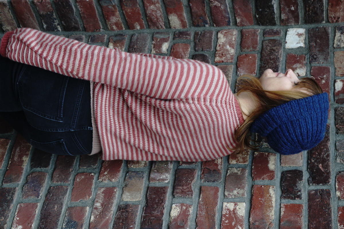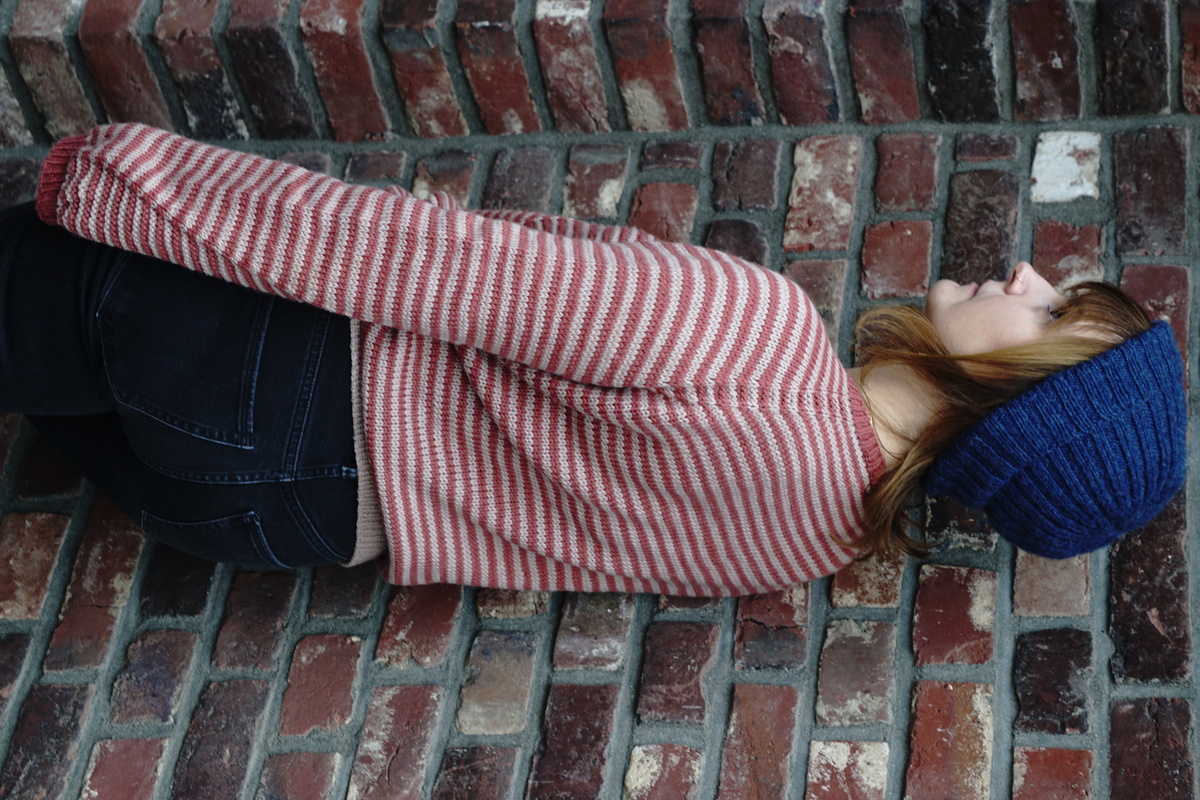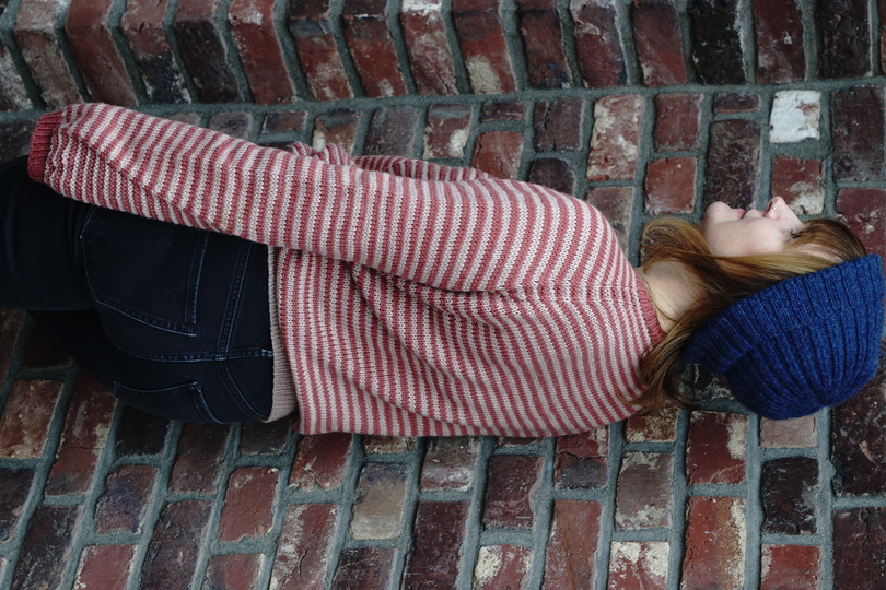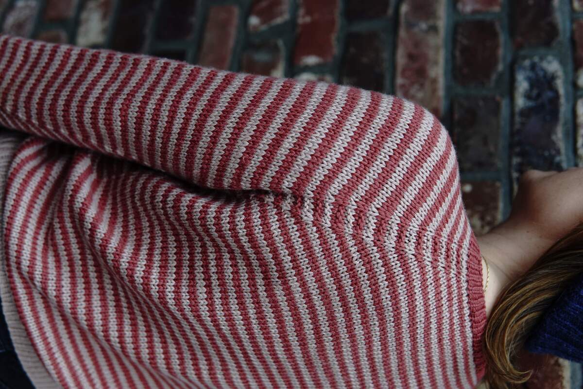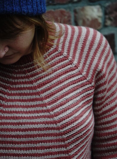 Streifen sind immer eine gute Idee, daher war es vollkommen klar, dass das SAEND-T ein Schwester-Design braucht – und zwar einen Pullover. Auch wenn das Konzept insgesamt das gleiche bleibt, verfügt der „SAEND sweater“ über einige zusätzliche Design-Elemente. Dieser einfache, formschöne Pullover bietet einige interessante Techniken, die ihm den letzten Schliff verleihen. Die Konstruktion ähnelt dem klassischen Raglan-Stil, aber du strickst die Zunahmen nicht nur beidseitig der typischen Raglan-Linien, sondern auch entlang der Kraus-rechts-Abschnitte, um lange Dreiecke zu kreieren, die bis zum Abschlussbündchen verlaufen. Ein ähnliches dreieckiges Kraus-rechts-Detail entsteht über die gesamte Länge des Ärmels bis zum Bündchen. Für einen klassischen Look werden der Kragen und alle Bündchen im 1x1-Rippenmuster gearbeitet. Beim Stricken wird es garantiert nicht langweilig: Auch wenn ein großer Teil aus Glatt-rechts-Muster besteht, sorgen die Abnahmen und Kraus-rechts-Passagen, genauso wie die Farbwechsel in jeder zweiten Runde, dafür, dass es interessant bleibt, ohne zu kompliziert zu werden.
