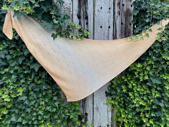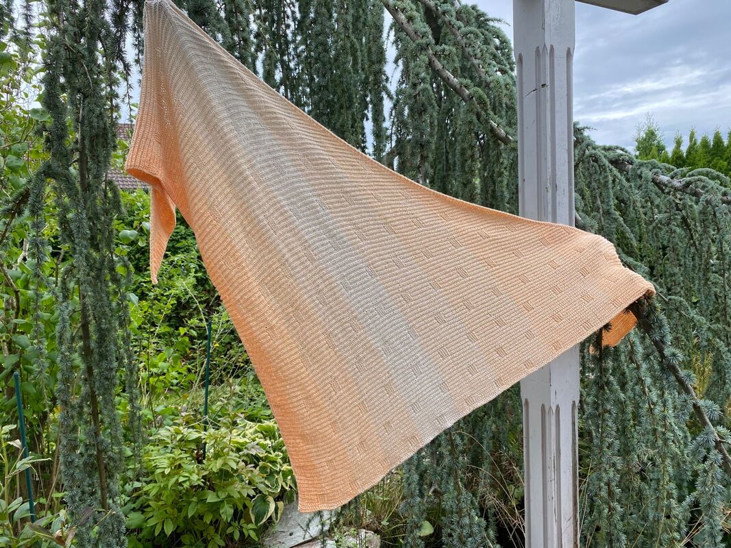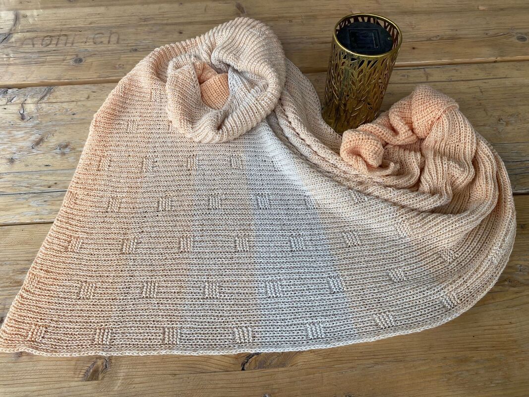 Ich habe 4 fädiges Farbverlaufsgarn aus Modal, einen sogenannten Bobbel, verwendet mit 1200 Metern bzw. 1400 beim Mustertuch in apricot. verwendet. 1000 Meter wiegen 286 Gramm.