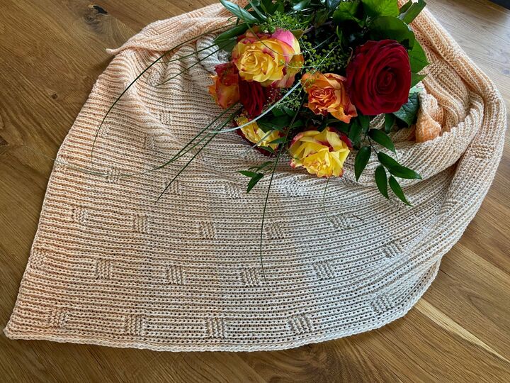 Bei dem Mustertuch in apricot wurden 1400 Meter verstrickt und es hat die Maße 210 x 80 cm.