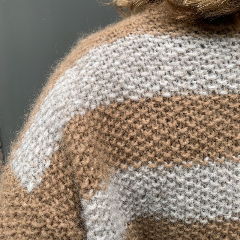Die Konstruktion ist leicht verständlich: Zuerst wird das Rückenteil gestrickt, dann entstehen die Vorderteile durch Maschenaufnahmen. Unter dem Armausschnitt werden alle Teile zusammengeführt und ohne Seitennähte bis zur gewünschten Länge gearbeitet. Die Ärmel werden direkt angestrickt, und ein I-Cord-Rand sorgt für einen sauberen, elastischen Abschluss.