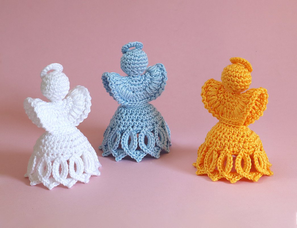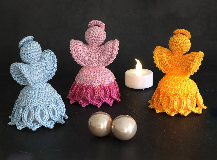 Du kannst den Engel entweder einfarbig in einem Stück häkeln – hier musst du nur den Endfaden vernähen – oder du verwendest für das Schleifenmuster eine 2. Farbe. Helle Farben lassen hierbei das Licht besonders schön durchscheinen.