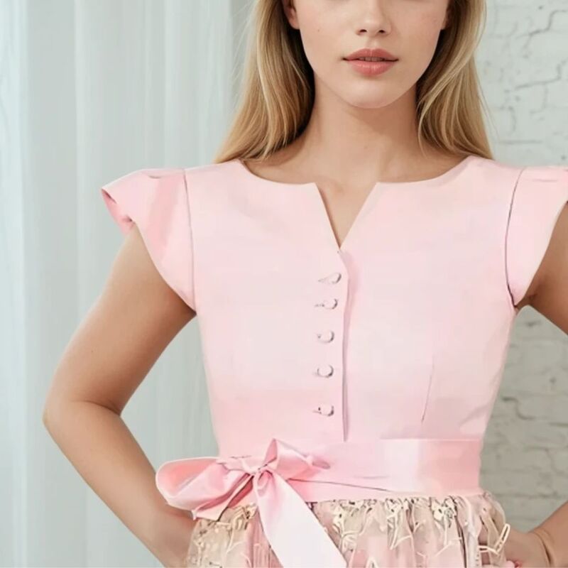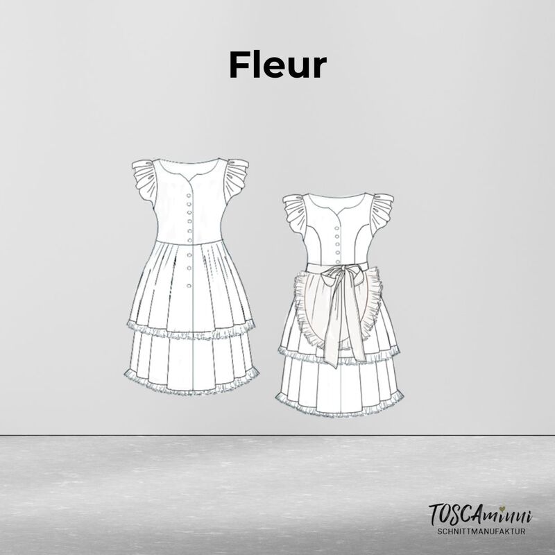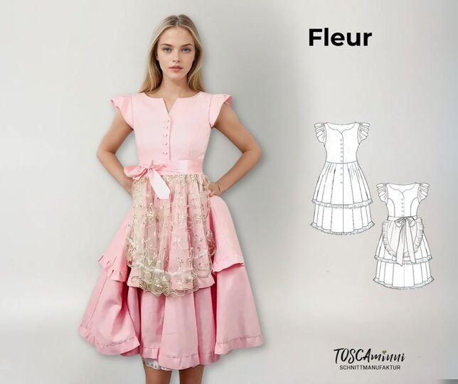 Mit dem Schnittmuster Fleur nähst du dir ein romantisches, vielseitig wandelbares Kleid als Dirndl, Cosplay-Kostüm oder Leinenkleid im Vintagestil. Das Design umfasst ein figurbetontes Oberteil und dekorativer Knopfleiste, kombiniert mit einem weit schwingenden, doppellagigen Rock mit Rüschenkanten. Besonders hervorstechend sind die zarten Flügelärmel sowie die Option, das Kleid mit einer Schürze zu einem zauberhaften Dirndl oder als einfaches Leinenkleid zu gestalten.