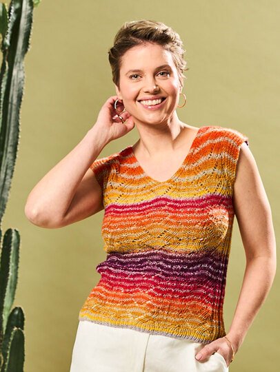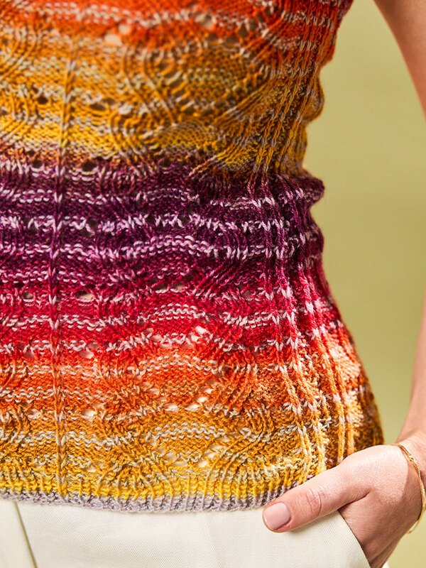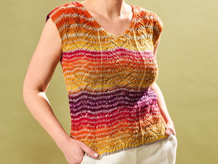 Der Pulli ist ein ärmelloses Kleidungsstück mit einem auffälligen, wellenartigen Muster in leuchtenden Farben. Die Palette reicht von warmem Orange über kräftiges Gelb bis hin zu tiefem Rot und Purpur, die sich harmonisch über den Oberkörper erstrecken. Der V-Ausschnitt verleiht dem Design eine elegante Note, während die texturierte Strickarbeit eine interessante Tiefe und Struktur bietet.