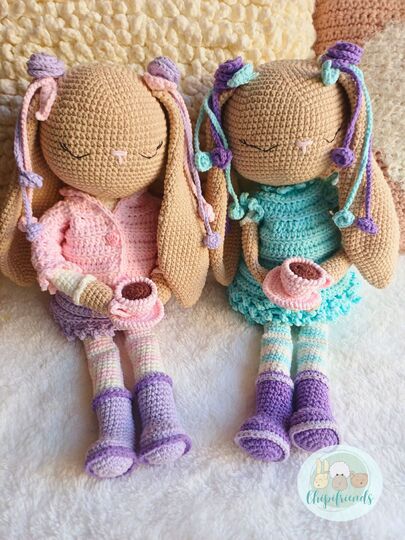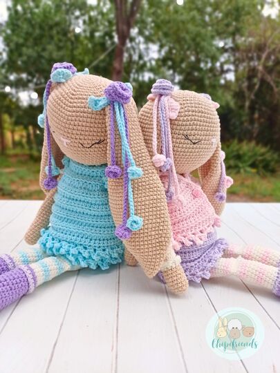 Die Puppen sind 40 cm groß, gehäkelt mit Baumwollgarn der Stärke Medium und einer 2 mm Häkelnadel.