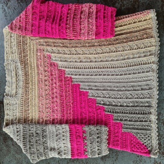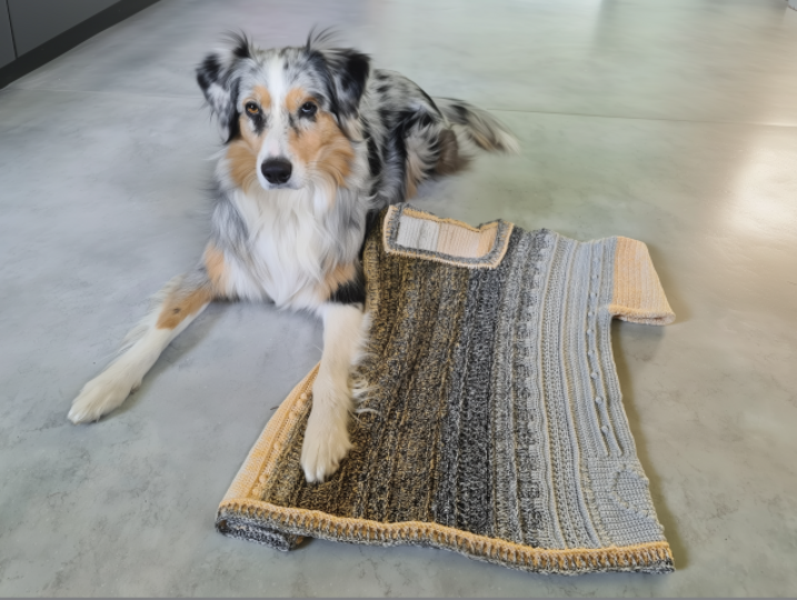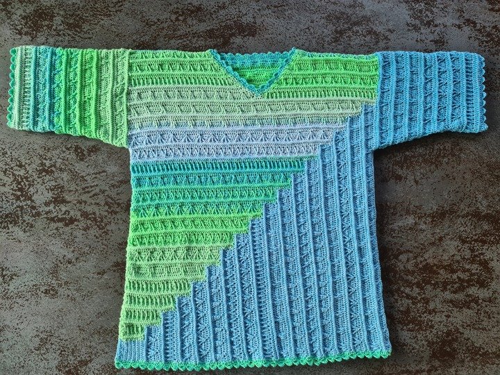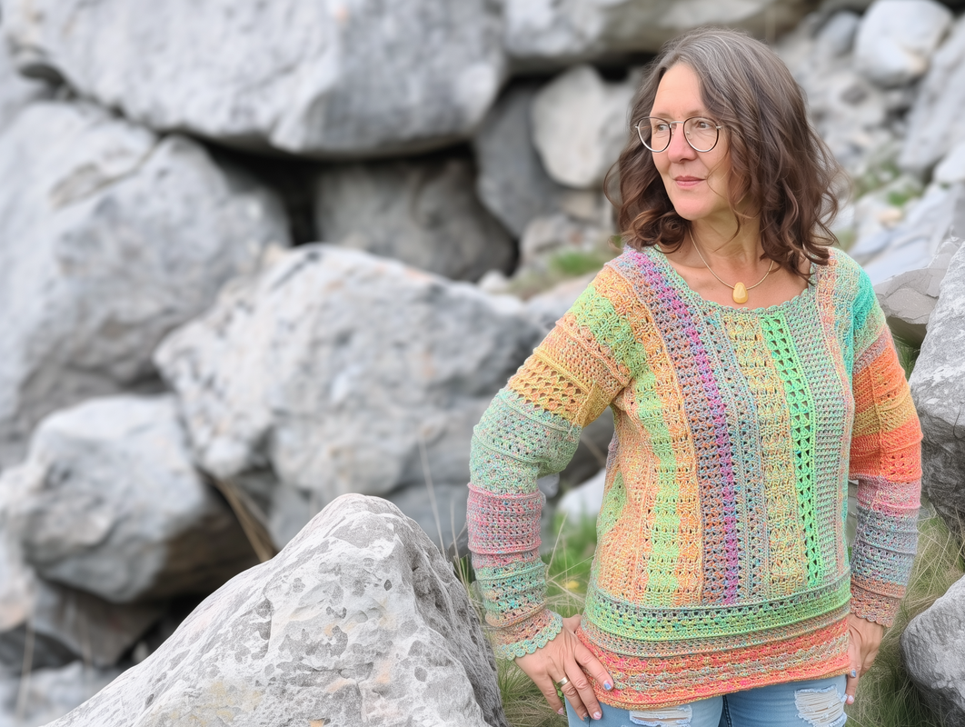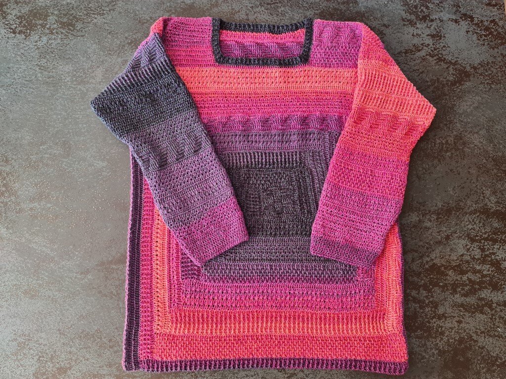 Von Ärmel zu Ärmel in einem Stück – ohne Nähte. Muster & Reihenanzahl werden gewürfelt.
