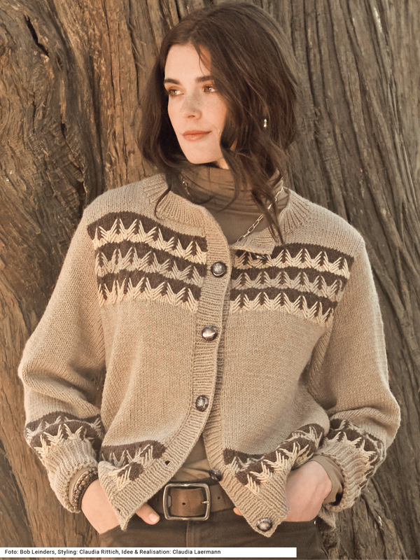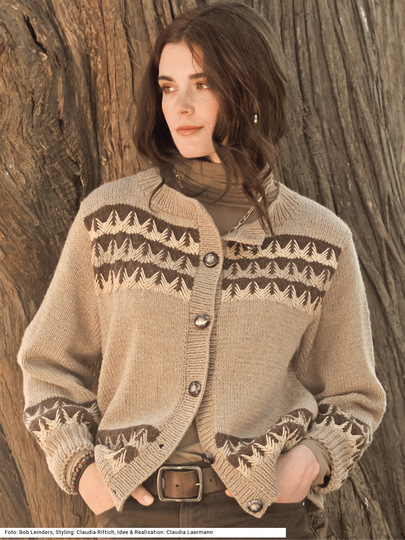 Das Hebemaschenmuster in einer raffinierten Variante mit langgezogenen Fäden gibt diesem Jacken-Klassiker eine moderne Note. Ein glattes reines Schurwollgarn in drei harmonisch aufeinander abgestimmte Farben lassen die Muster – glatt rechts und Hebemaschen, aber auch die Rippen an Bund und Blenden – besonders markant zur Geltung kommen. Die Ärmel sind ganz gerade und weit geschnitten. Geschlossen wird die Jacke mit sechs kontrastfarbigen Knöpfen. Eine Anleitung kann für die Größen 38/40 und 44/46 sowie 50 downgeloadet werden.