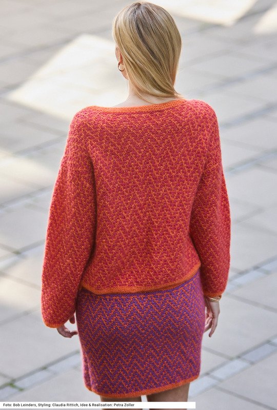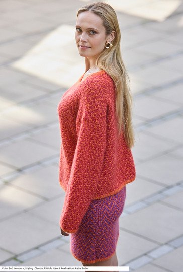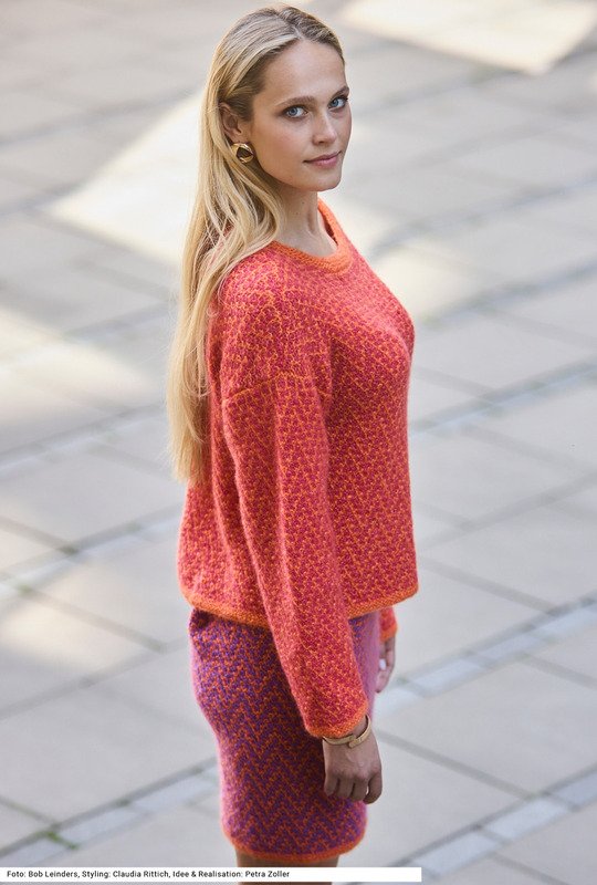 Dieses Set, bestehend aus Pulli und Minirock, ist perfekt für alle, die hochwertige Qualitäten zu schätzen wissen: Das Garn aus Mohair und Seide ist leicht, kuschelig und herrlich angenehm zu tragen. Die kraftvolle Farbkombination, bei der eine Farbe sowohl in Pulli als auch im Rock vorkommt, die andere jedoch variiert, macht den Zauber dieser Kombi aus. Wem der Rock zu kurz erscheint, kauft einfach ein Knäuel mehr und strickt das Hebemaschenmuster entsprechend länger. Für das Muster werden immer zwei Reihen in einer Farbe gearbeitet. Alle Ränder sind kraus rechts gestrickt. Die Anleitung dazu gibt es für die Größen 38/40, 42/44 und 46/48.