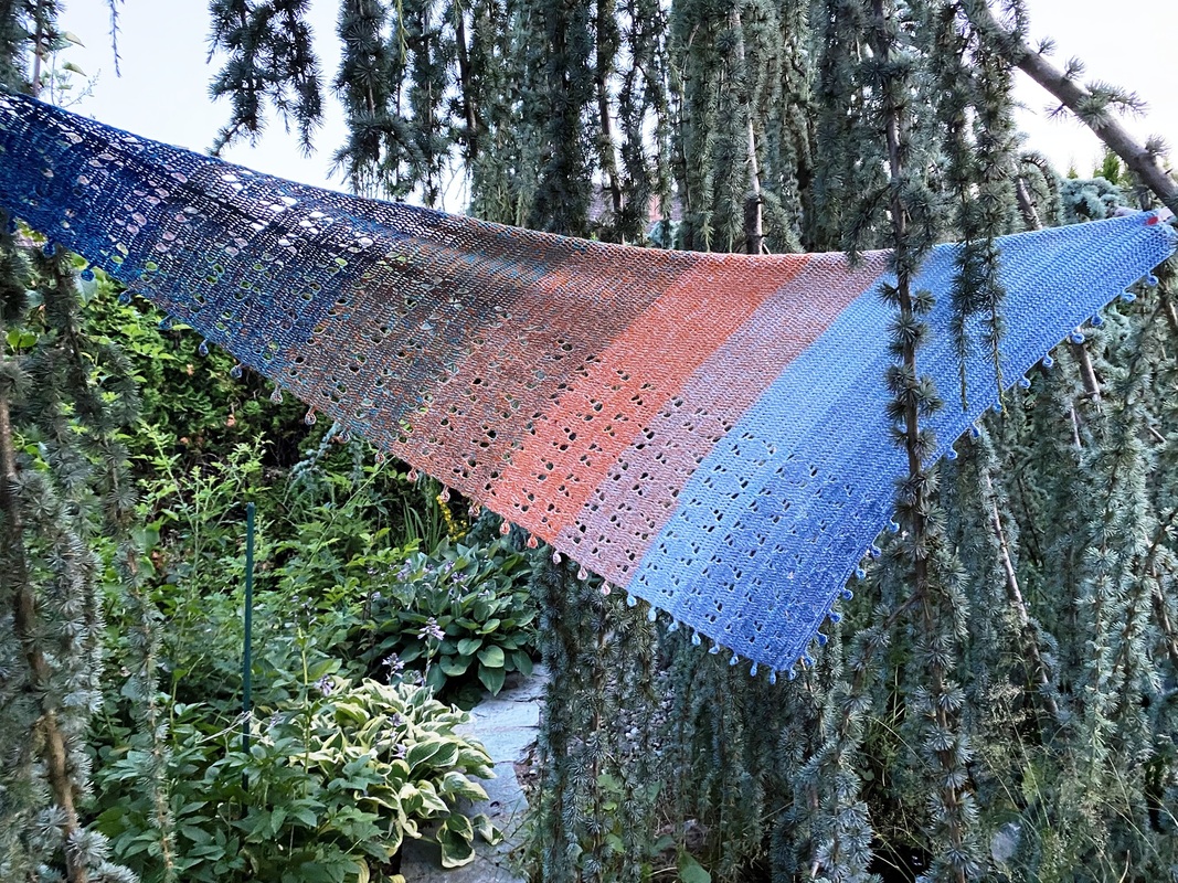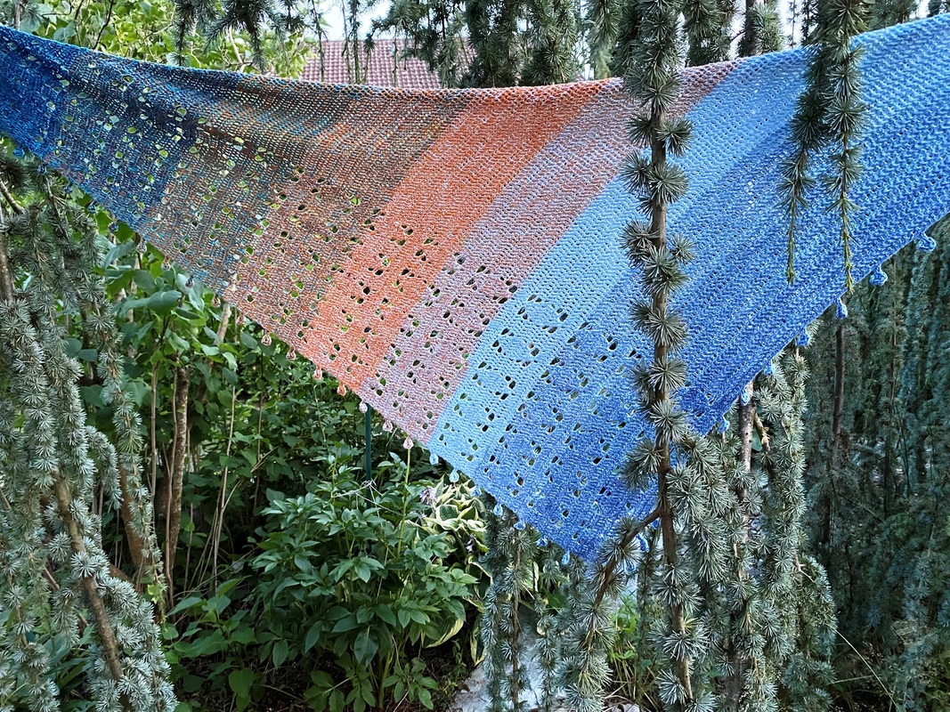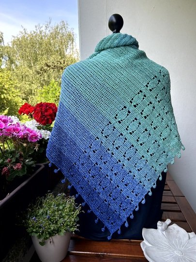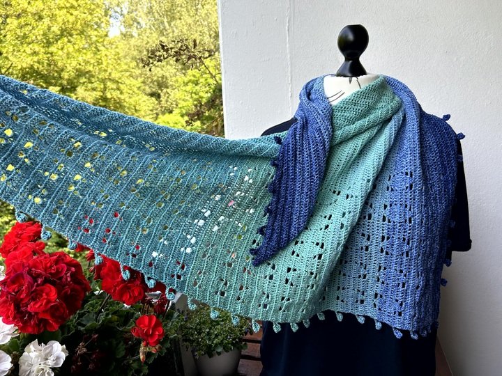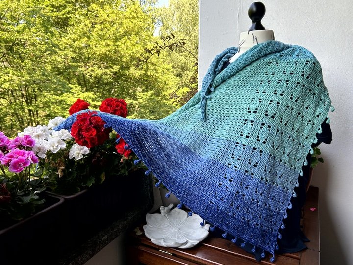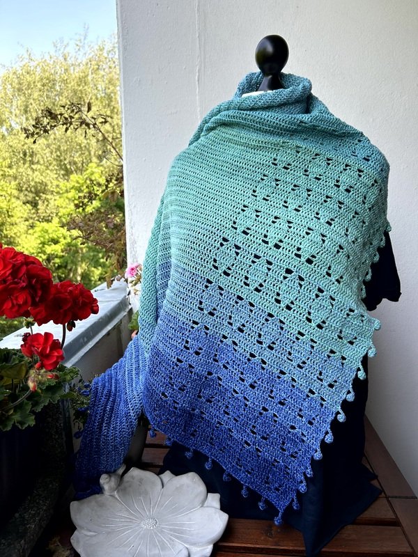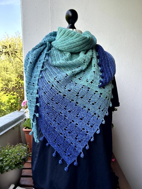Bei Farbverlaufsgarn empfehle ich je nach Wunschgröße und Häkelstil eine Lauflänge ab 850 m 4-fädig und eine dazu passende Nadelstärke. Bei fester Häkelweise solltest du mindestens 1000 m 4-fädig einplanen.