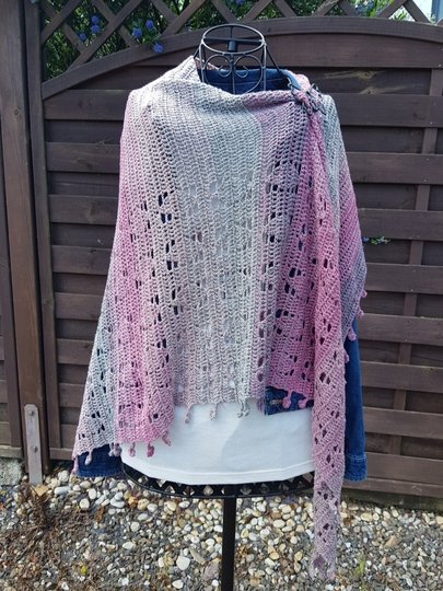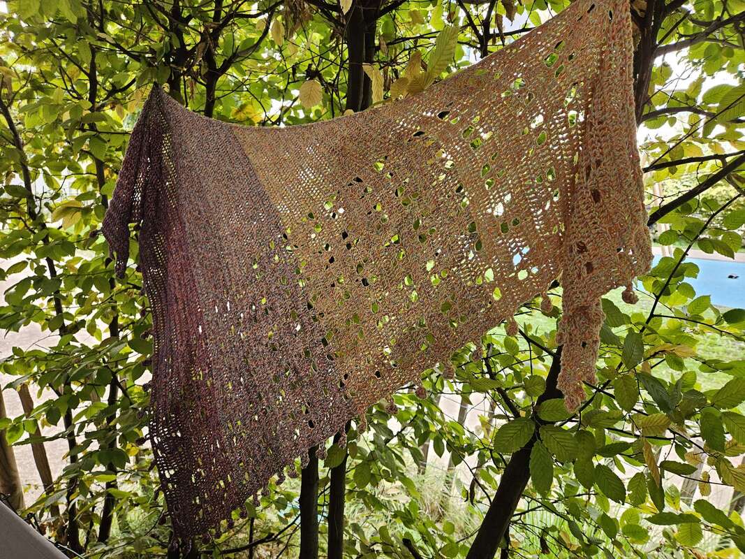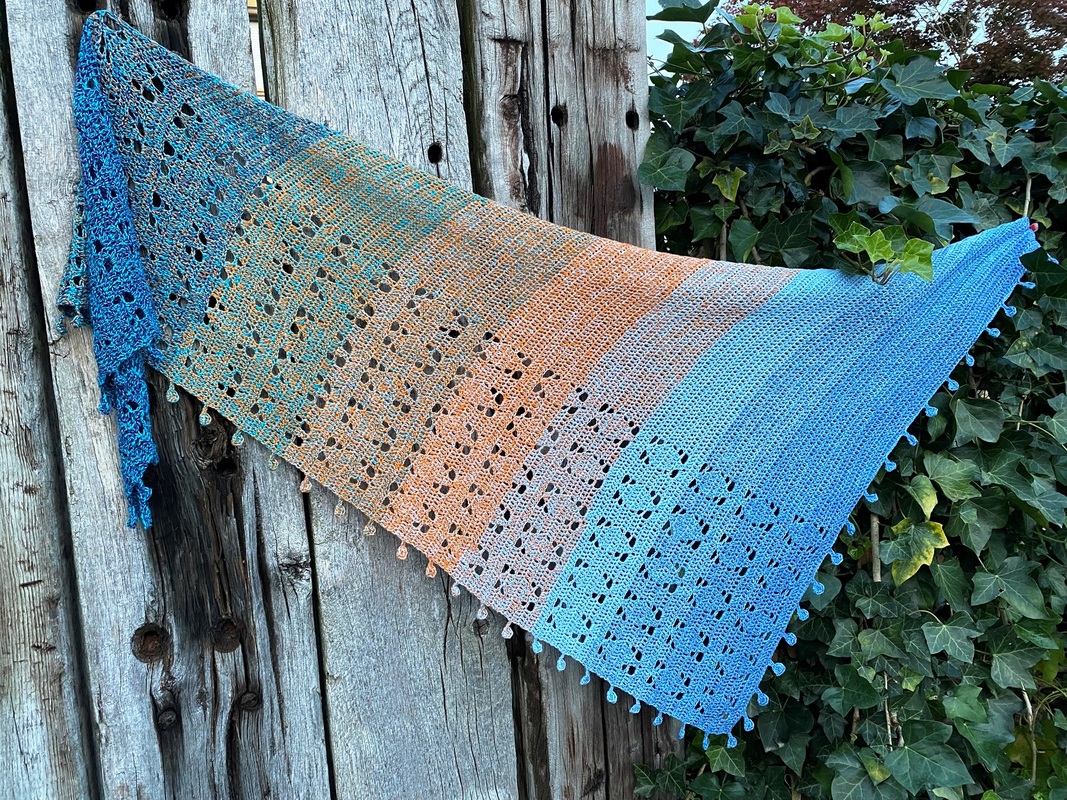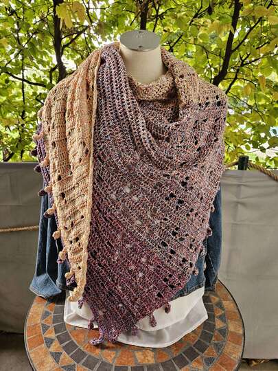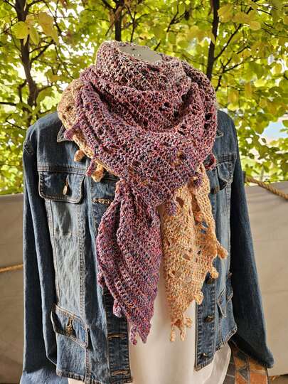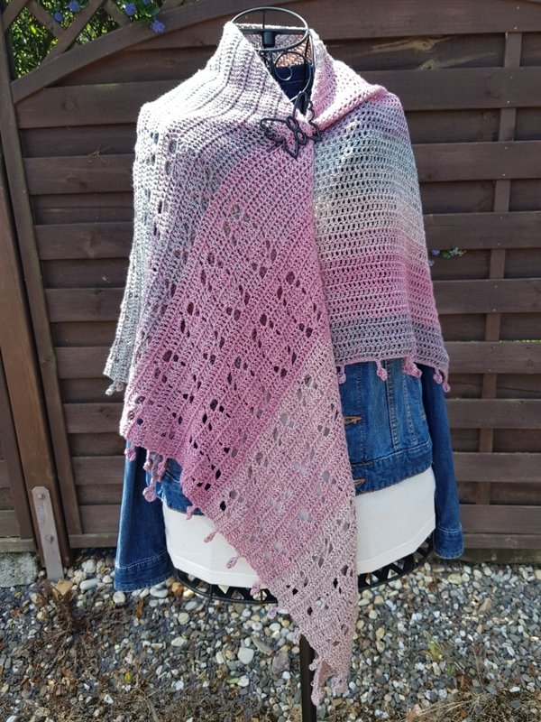 Bei Farbverlaufsgarn empfehle ich je nach Wunschgröße und Häkelstil eine Lauflänge ab 850 m 4-fädig und eine dazu passende Nadelstärke. Bei fester Häkelweise solltest du mindestens 1000 m 4-fädig einplanen.