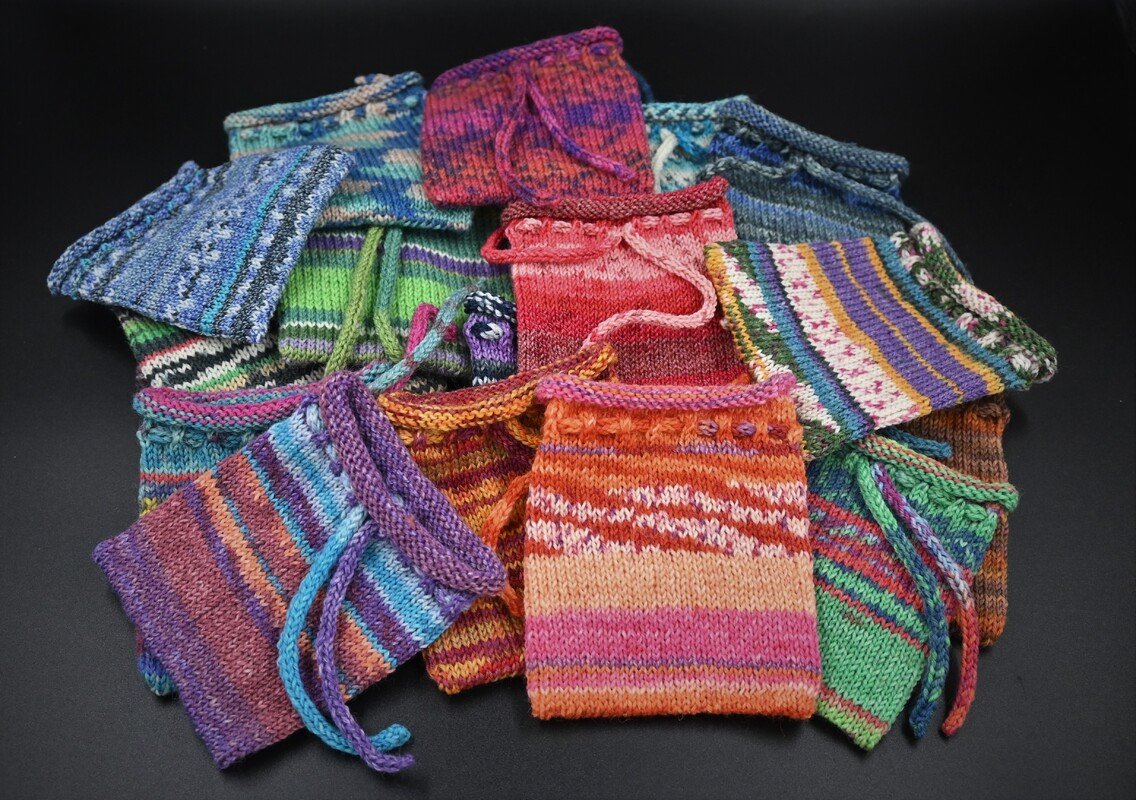 Diese Strickanleitung zeigt dir Schritt für Schritt, wie du 24 hübsche Adventsbeutel (ca. 10 × 10 cm) aus Sockenwollresten zauberst.