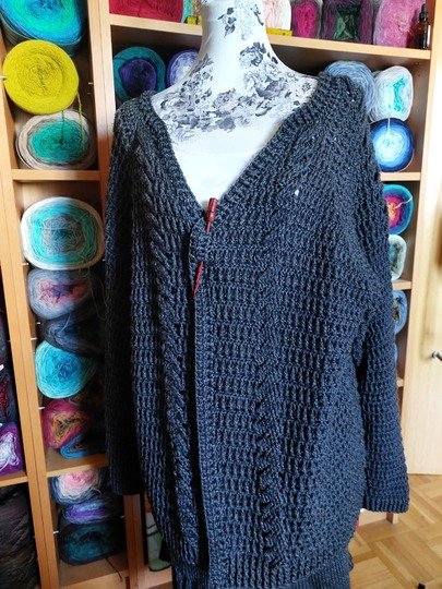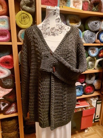 Es kann mit jedem gewünschten Garn gehäkelt werden. Meine Jacke ist aus einem Bobbel von Elke Bock gehäkelt, mit Kaschmir, Merino und Seide – wunderbar warm. Die benötigte Lauflänge richtet sich nach der gewünschten Größe, Länge und Form, einen ersten Anhaltspunkt bieten die Verbrauchsbeispiele.