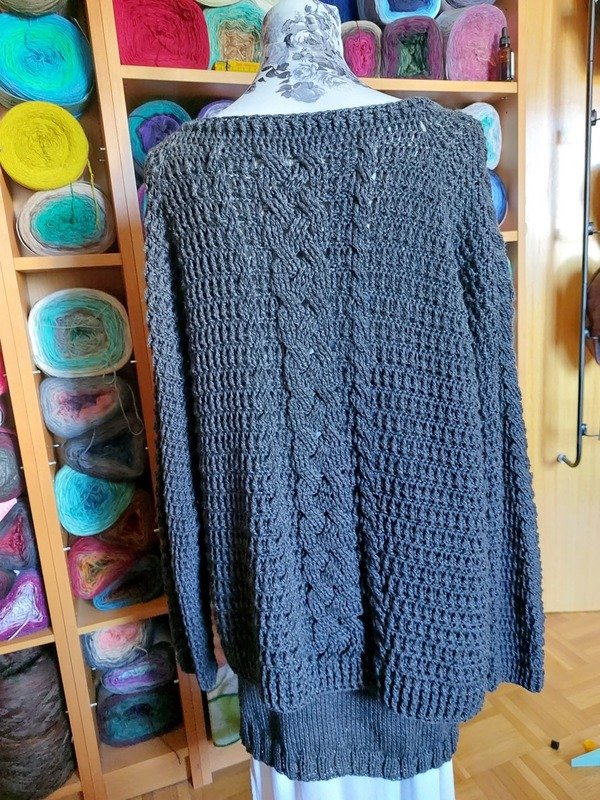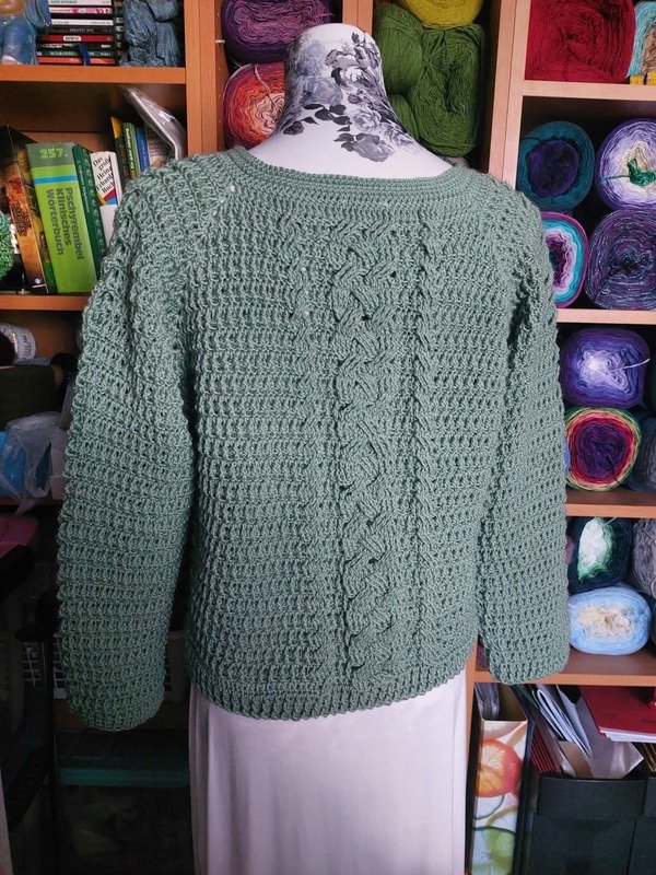 Wie immer gilt: fertige Größe und Verbrauch sind neben Fadenzahl und Nadelstärke auch sehr abhängig vom eigenen Häkelstil und der gewünschten Länge für Korpus und Ärmel!