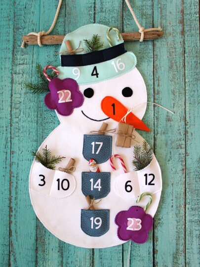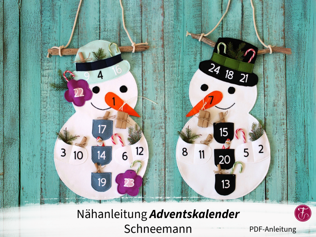 Diese Nähanleitung in deutscher Sprache zeigt dir, wie du das Schneemannpärchen selbst herstellen kannst. Auf jeden Schneemann werden 12 Täschchen/ Fächer aufgebracht, um insgesamt 24 Kleinigkeiten einzustecken.