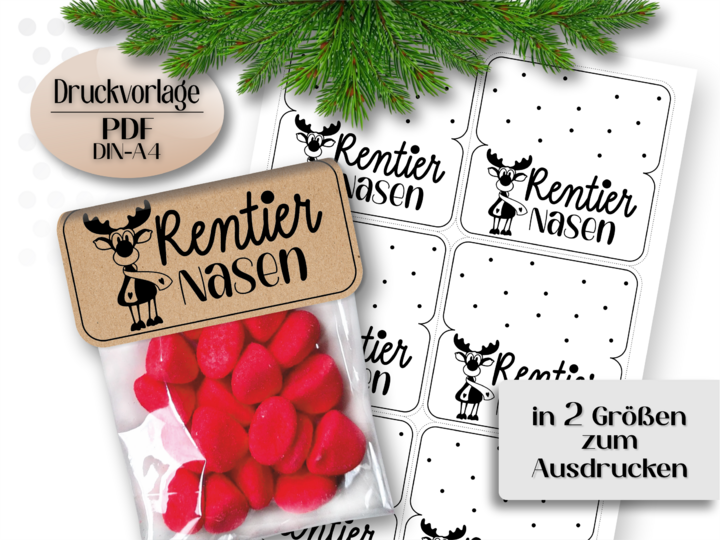 Druckvorlage PDF Rentiernasen Tütenverschluss Tütenklappe Weihnachten in zwei Größen.
