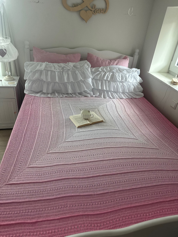 Da die Decke von innen nach außen gehäkelt wird, kann die Größe ganz individuell bestimmt werden. Daher kann auch z.Bsp. eine Babydecke angefertigt werden