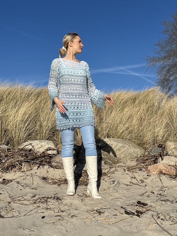 besonders gut eignen sich hier Farbverlaufsgarne, weil der Pulli mit einem Rutsch von der Häkelnadel hüpft