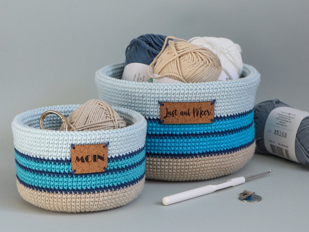 Die Körbchen können auch sehr gut von Anfängerinnen und Anfängern nachgearbeitet werden, denn es werden nur feste Maschen in Spiralrunden gehäkelt.