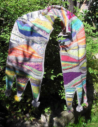 Der Schal wird mit verschiedenen Farben quer gestrickt. Da er sich aus vielen Farbfeldern zusammensetzt, kann er auch kürzer gestrickt werden. Er eignet sich ideal um viele Wollreste zu verarbeiten. Man braucht pro Farbfeld ca 5 - 10 g Wolle. Die umfangreiche Strickanleitung enthält eine Strickschrift in der jede Reihe beschrieben ist. Damit dürfte es nicht all zu schwierig sein, diesen Schal nach zu stricken.