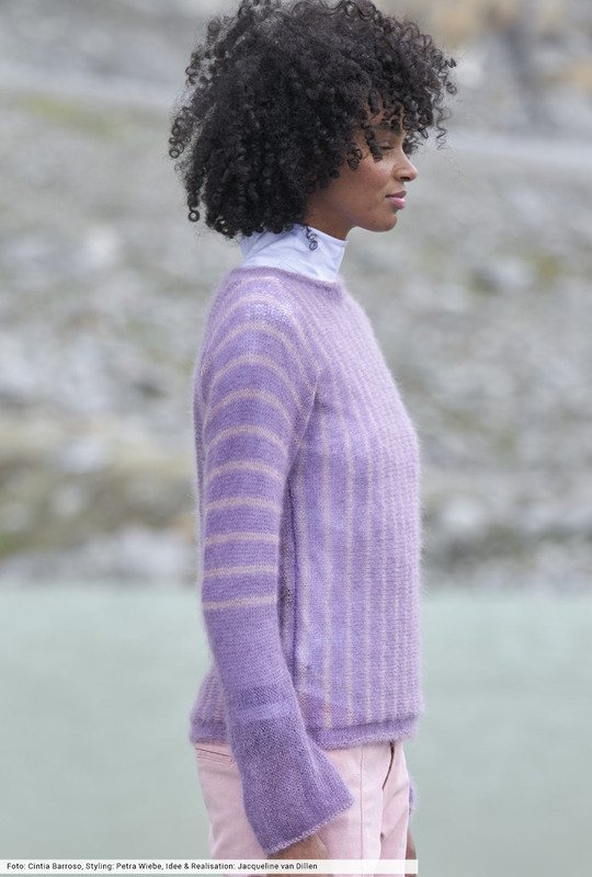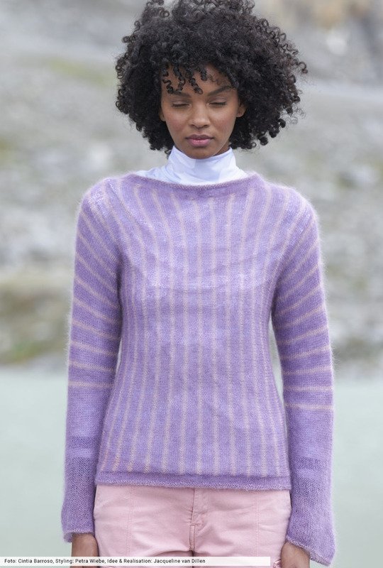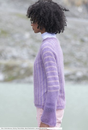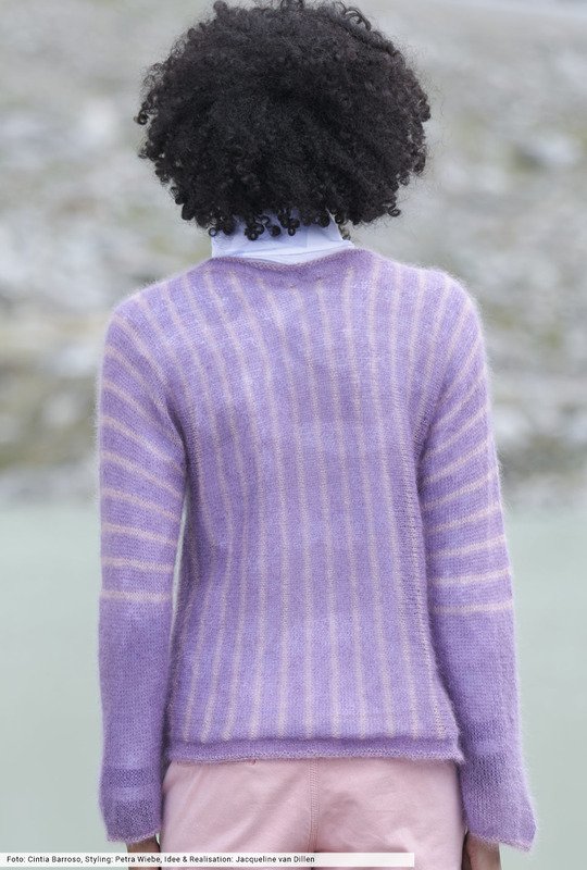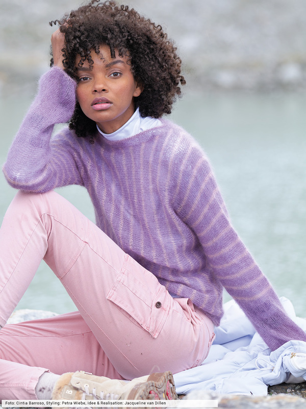 Von Ärmel zu Ärmel gestrickt legen sich bei diesem Fledermauspulli die schmalen Streifen quer. Das ergibt eine ganz neue Optik, die auch noch der Figur gut tut, da sie streckend wirkt. Zum Schluss bilden die schmallen Glatt-rechts-Blenden an der Saumkante und am Halsausschnitt den Rahmen. Für Formstabilität sorgen die doppelfädig gestrickten Kraus-rechts-Kanten. Zum Thema Konfektion: Du musst hier nur die Seiten- und unteren Ärmelnähte schließen.