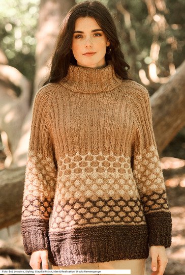 Der bis über die Hüften reichende Raglan-Pullover mit großzügigem Rollkragen ist ein idealer Begleiter für kalte Tage. Er ist aus einem baumwollenen Schlauchgarn gestrickt, in dessen Inneres gefärbte Schurwollfasern eingeblasen werden; es hat einen super soften, wattig zarten Griff. Abwechslungsreiche Muster lassen das Stricken zu einem wahren Vergnügen werden. Am Bund beginnt es mit 2/2-Rippenmuster, gefolgt von Querrippenmuster und Hebemaschenmuster in drei Farben. Die einzelnen Teile werden auf eine Rundstricknadel genommen und die Passe mit betonten Raglanabnahmen im Rippenmuster beendet. Eine Anleitung kann für die Größen 36/38, 40/42 und 44/46 downgeloadet werden.