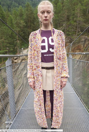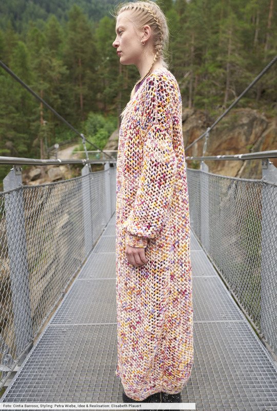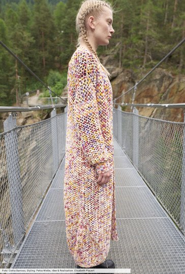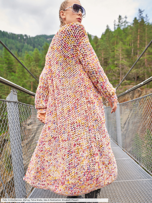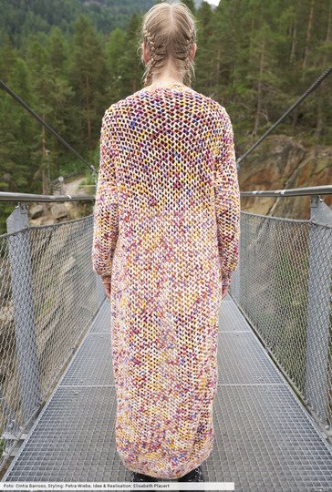 Jede Menge guter Vibes vermittelt dieser lange, schmal geschnittene und verschlusslose Strickmantel. Das kommt natürlich durch das bunt melierte Wintergarn, bei dem Schurwolle mit einem kleinen Anteil Polyamid gemixt wurde. Aber auch das gleichmäßige Netzmuster macht gute Laune, da hier auch Strickneulinge zum Erfolg kommen. Zu kurzen Röcken und derben Boots eine Augenweide für selbstbewusste Youngsters.