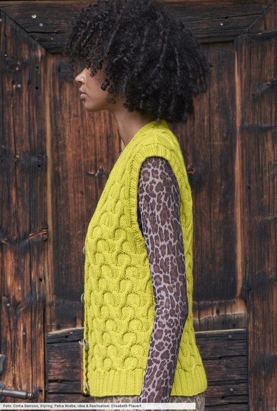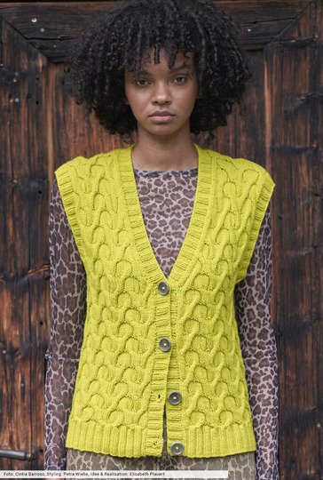 In sich versetzte Zöpfe lassen bei dieser Weste eine Art Wabenmuster entstehen, das sich fast dreidimensional all over in Szene setzt. Dafür sorgt auch das Garn, bei dem zur Schurwolle ein hoher Kaschmir-Anteil hinzugefügt wurde, der für Luxus und komfortables Tragegefühl zuständig ist. Den Rahmen bilden klassische Rippenbündchen und dem Farbthema angepasste Knöpfe, die du direkt über den Hersteller beziehen kannst.