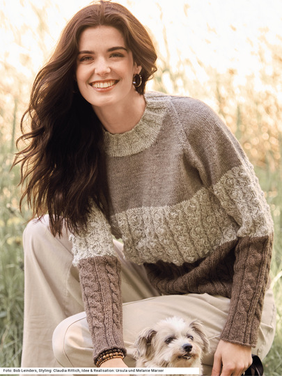 Ob mit zurückhaltenden Naturfarben oder in kräftigen Farbtönen, die breiten Musterstreifen dieses Raglanpullis begeistern mit verschiedenen Zopf- und Noppenmustern, die den rustikalen Charakter des robusten, aber dennoch angenehm weichen Garns aus reiner Schurwolle unterstreichen. Die breiten Rippen des Bunds gehen fließend über in ein Zopf-Rippenmuster in neuer Farbe, gefolgt von einem Zopf-Noppenmuster in wieder anderer Farbe und schließlich wird die Musterfolge mit glatt rechts in noch einer weiteren Farbe beendet. Betonte Abnahmen kennzeichnen die Raglanschrägungen. Eine Anleitung gibts für die Größen 38/40, 42/44 und 46/48.