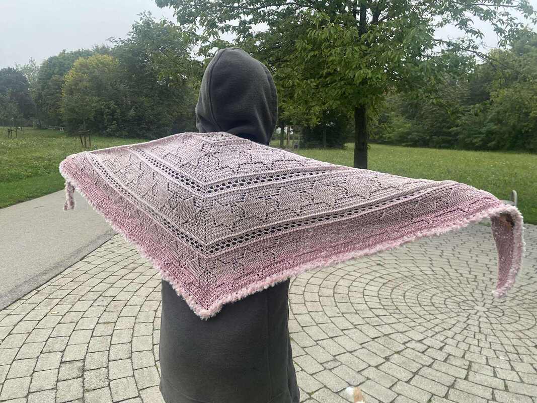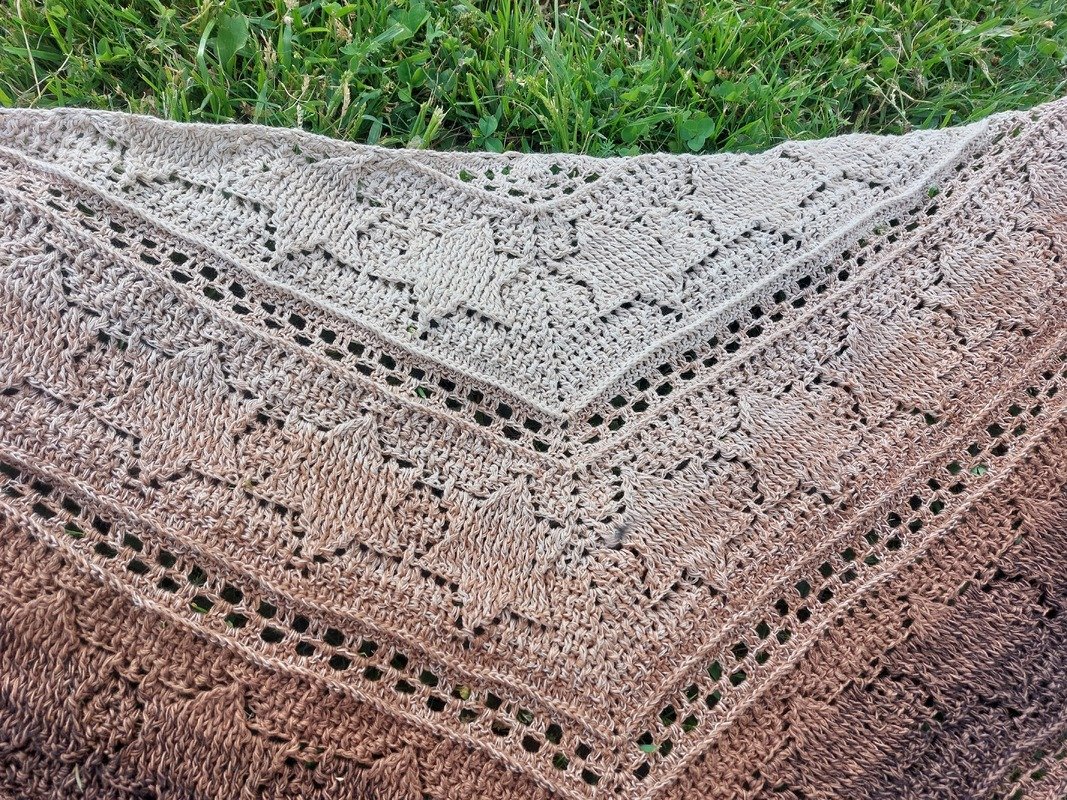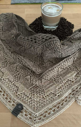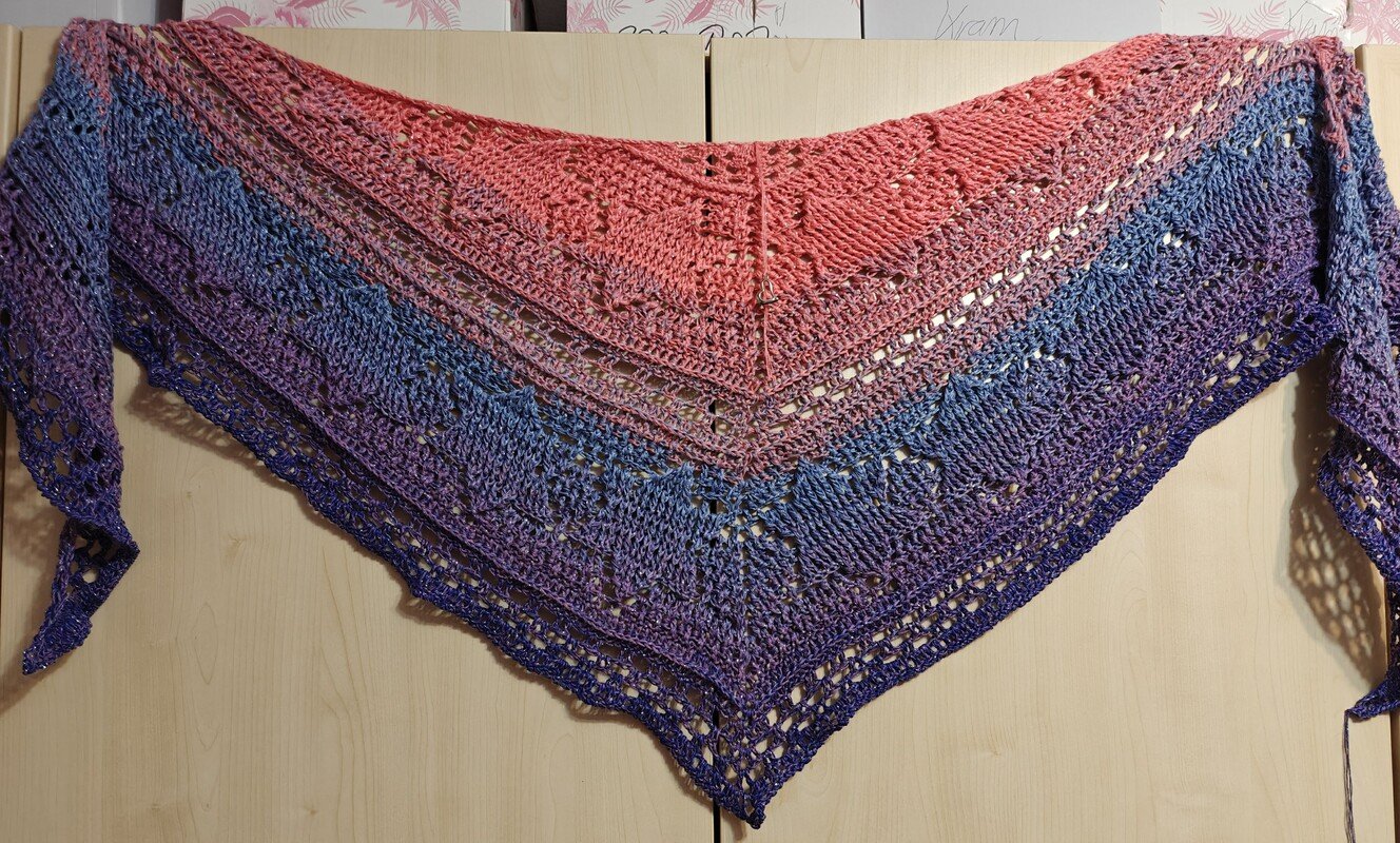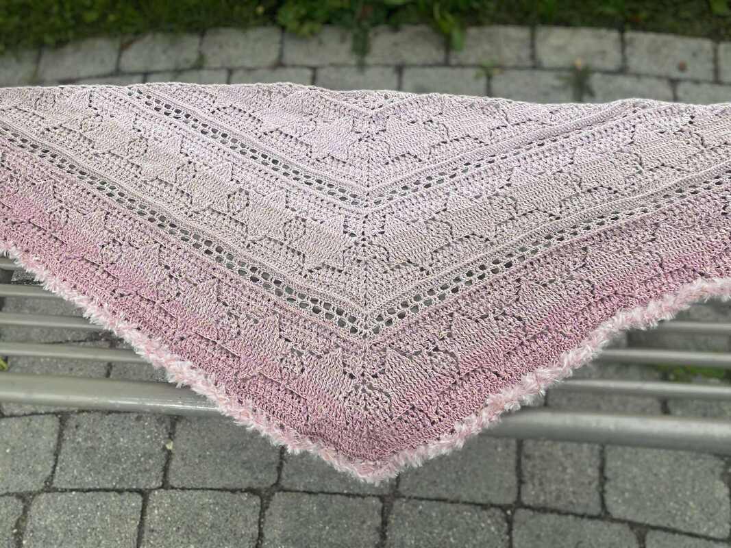 Mit den angegebenen Materialien und drei Mustersätzen habe ich ein Tuch von 240 x 70 cm gehäkelt.