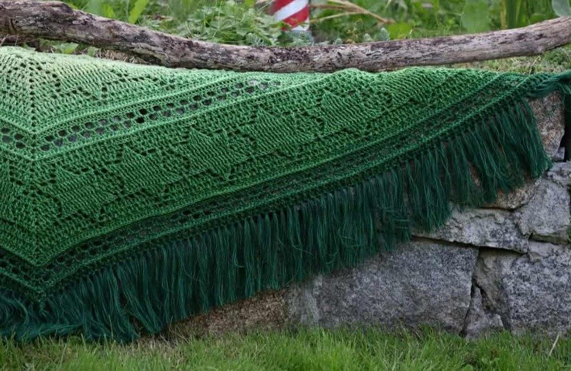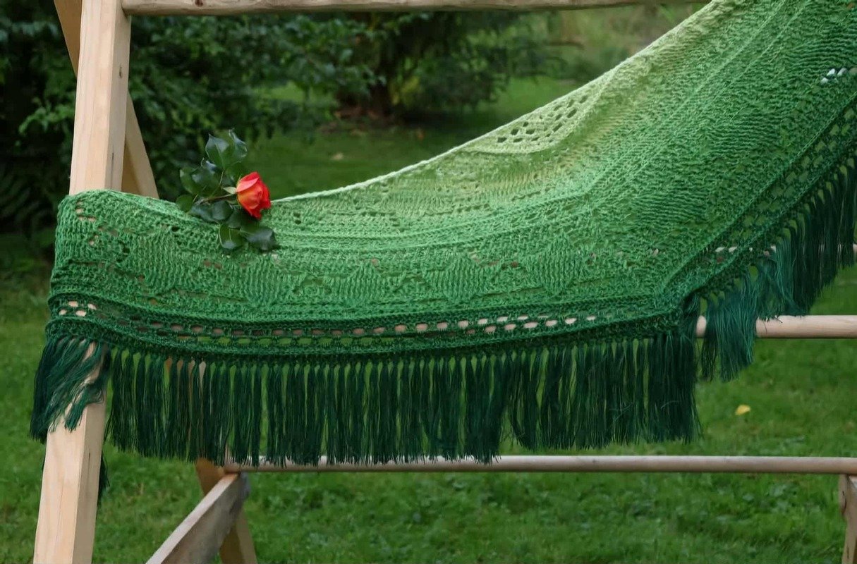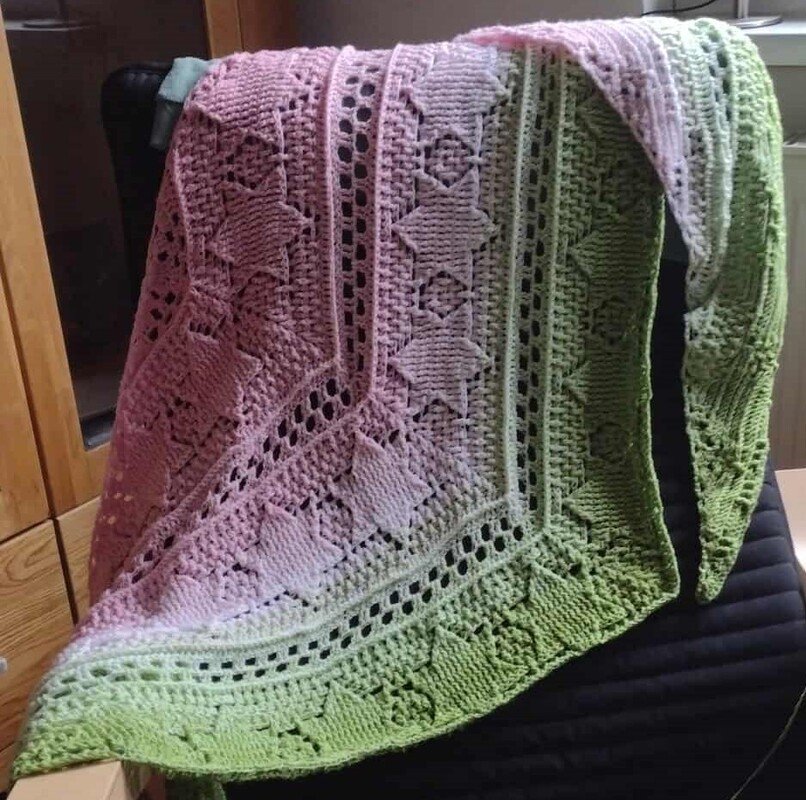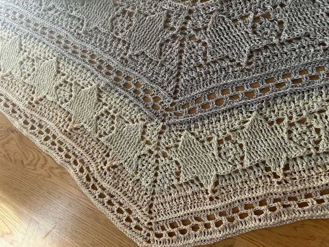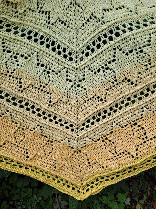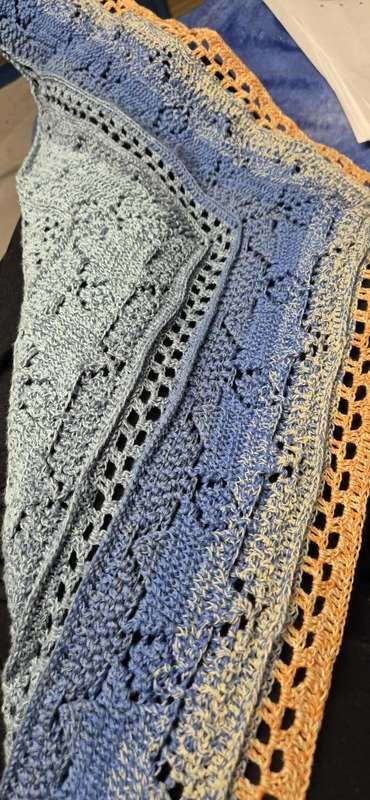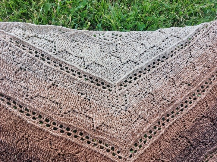 Mit den angegebenen Materialien und drei Mustersätzen habe ich ein Tuch von 240 x 70 cm gehäkelt.