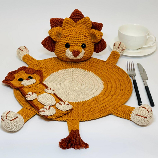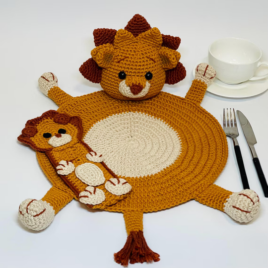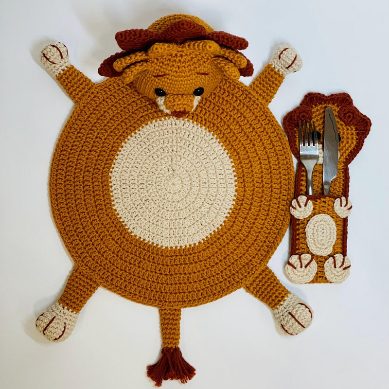Dies ist eine Häkelanleitung für eine Löwen-Tischset, geschrieben in Englisch und Deutsch.