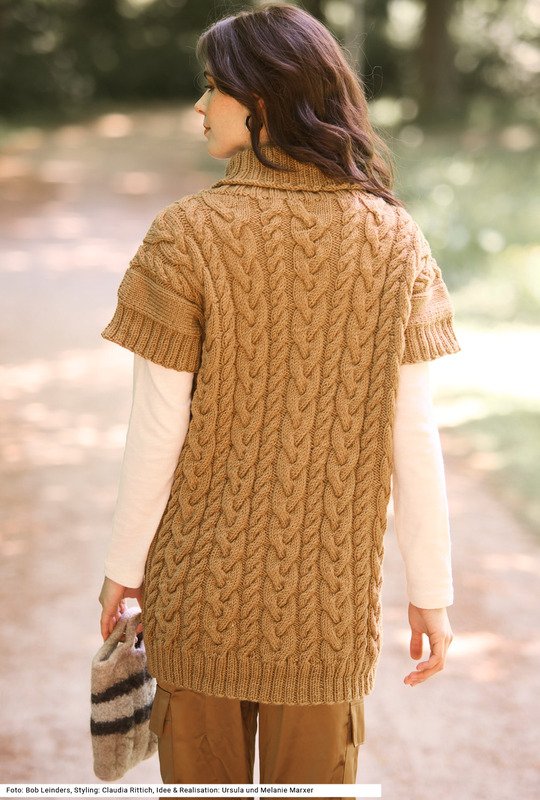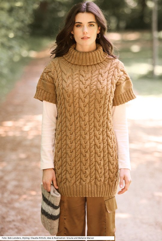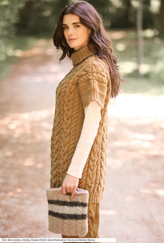 Mit diesem Set kannst du einen extralangen Pullunder mit einer gefilzten Tasche kombinieren. Das prägnante Zopfmuster des Pullunders erscheint bei der dreifarbigen Tasche in anderer Variante. An den Seitennähten verlaufen vertikal glatt rechte Streifen, die breiten Zöpfe komme nur in der Mitte vor. Der Rollkragen, der Bund und die Armausschnittblenden an den überschnittenen Schultern werden im 2/2-Rippenmuster gearbeitet. Beide Teile werden mit einem Garn aus reiner Schurwolle gearbeitet. Eine Anleitung gibt es für die Größen 38/40 und 42/44 sowie 46/48; Tasche: 23 x 27 cm (gefilzt).