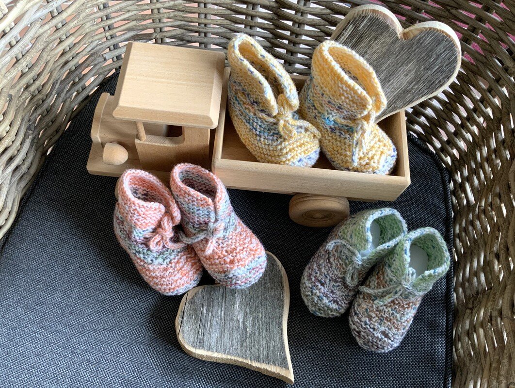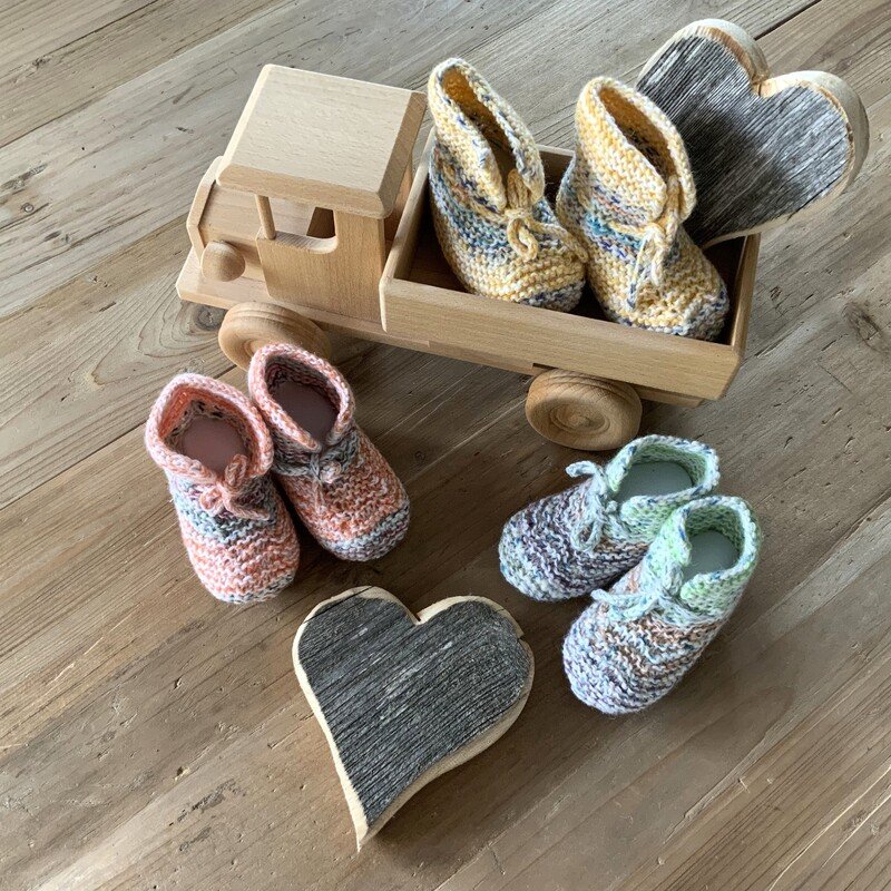 „Dianne“, kleine Schühchen für Babys. Doppelfädig (1 x uni, 1 x bunt/musterbildend), kraus rechts gestrickt und dadurch kuschlig weich und warm. Man beginnt das Bündchen in Reihen, arbeitet dann eine Reihe mit kleinen Löchern zum Durchziehen des Bindebandes. Dann geht es weiter auf 4 Nadeln in Runden. Der Fuß wird dann durch Zunahmen geformt, die Sohle im Anschluss durch Abnahmen. Diese wird dann direkt beim Abketten geschlossen. Für die Bindebänder strickt man einfach I-Cord-Schnüre mit 2 Maschen, die dann durch die Öffnungen im Bündchen gezogen werden.