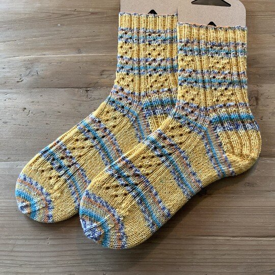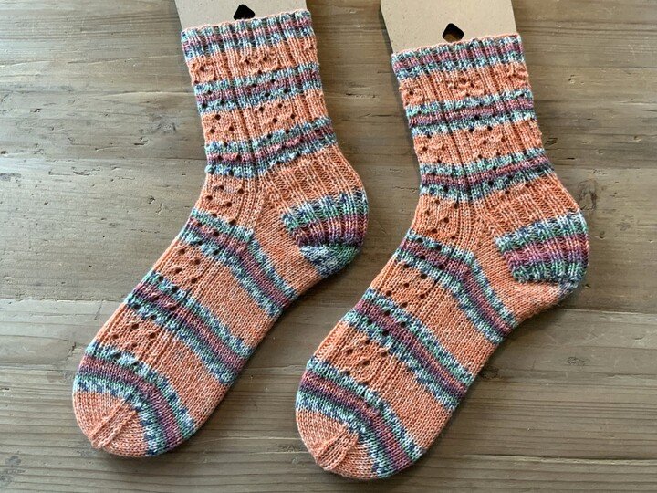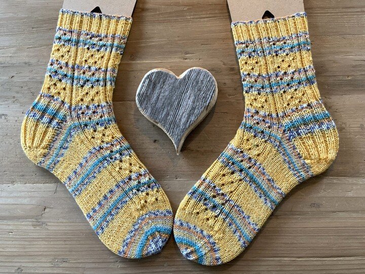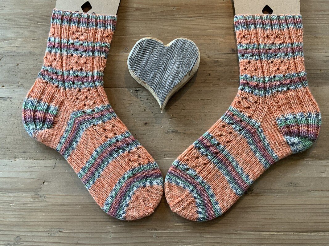 „Daaje“, sind Socken mit Ajourmusterstreifen, die sich mit einfachen Rippen abwechseln (Ajour-Rippenmuster). Die Rippen werden an der Fersenrückwand fortgesetzt. Die Socken werden von oben nach unten gestrickt. Ich habe die Ferse als Herzchenferse (mit Doppelmaschen) gearbeitet und eine Bandspitze gestrickt und beschrieben. Ferse und Spitze können jedoch auch anders ausgeführt werden. Die Anleitung enthält Angabe für die Größen 36 bis 47, lässt sich aber ganz einfach auch für andere Größen abwandeln, da das Rippenmuster einfach angepasst werden kann