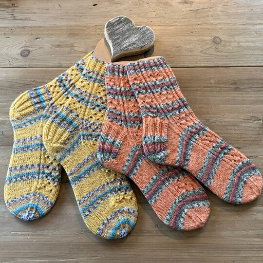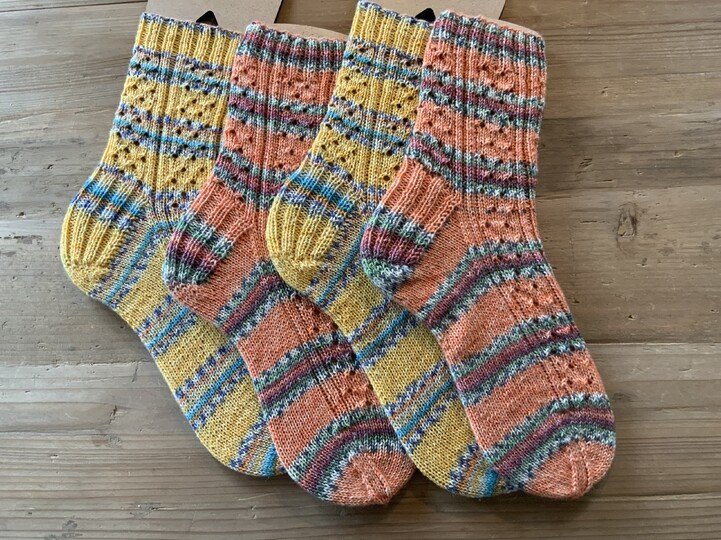 Anmerkung: Beide Mustersockenpaare sind in Größe 40/41 gestrickt, ein paar in der Farbe „Ringelblume“ (orange/bunt) das andere in „Sonnenblume“ (gelb/bunt)