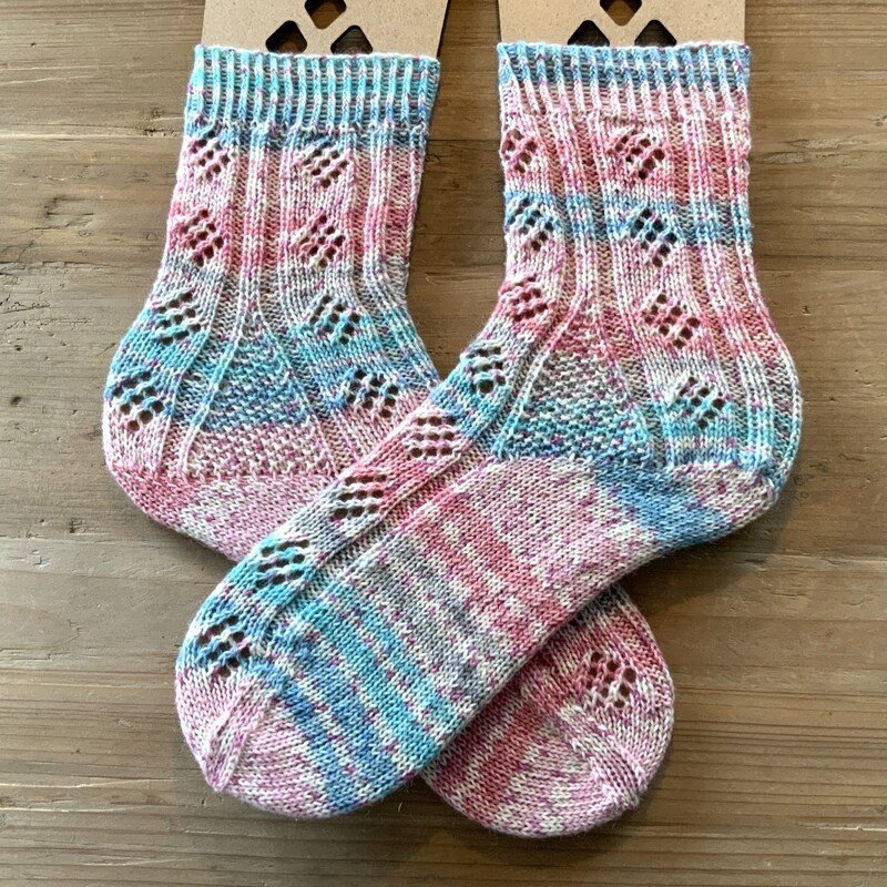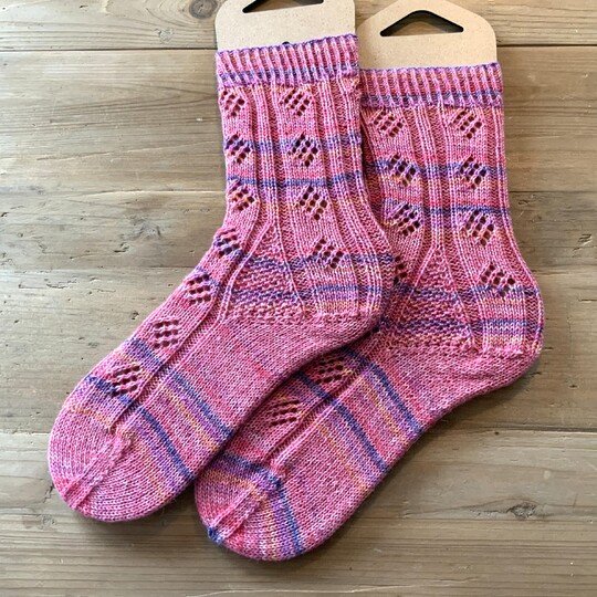 Anmerkung: Die Mustersocken sind in Größe 40 in der Farben Tulpe (rosa/türkis/weiß) und in Pfingstrose (pink/ blau/orange) gearbeitet